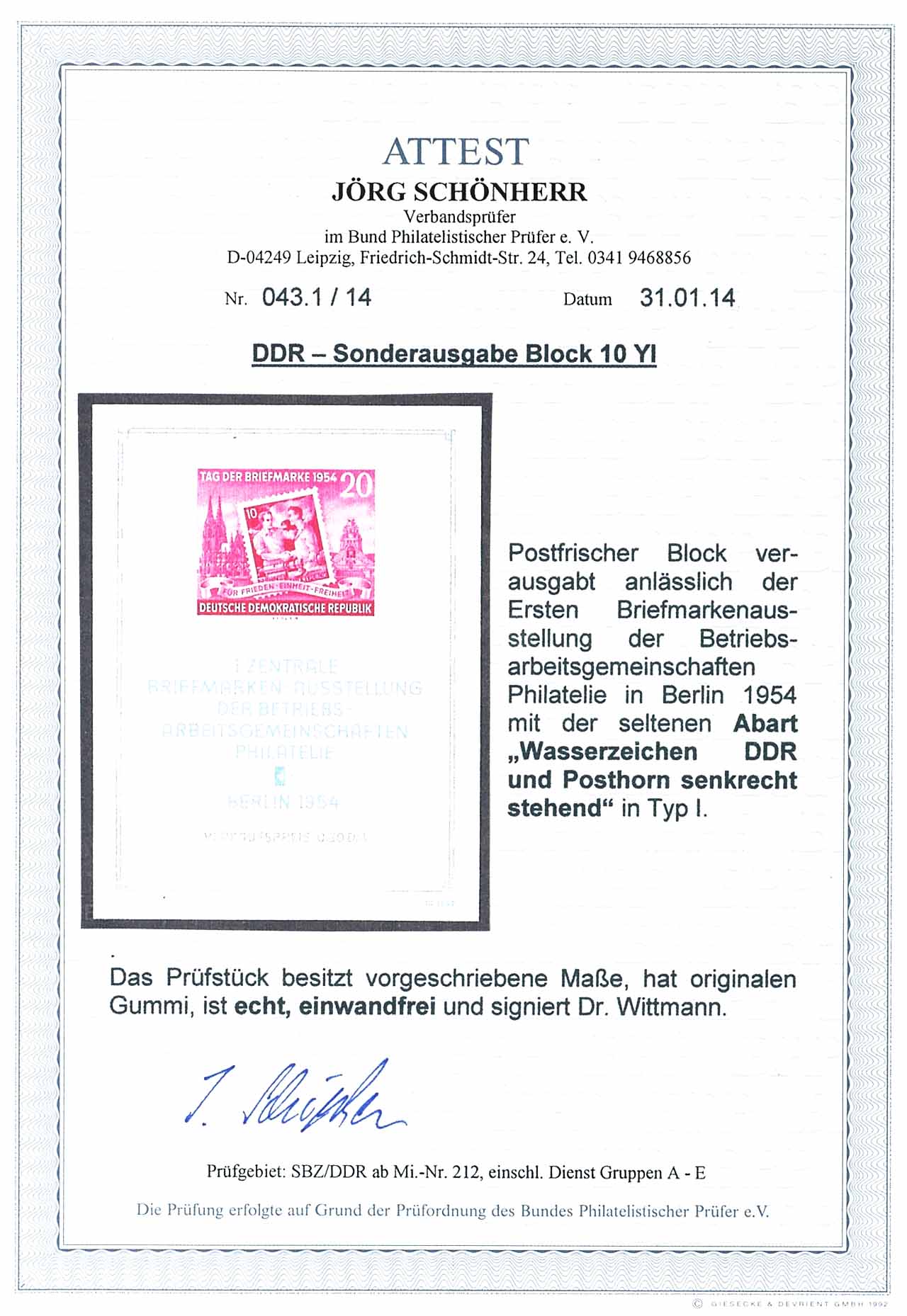 Blockausgabe "Erste Zentrale Briefmarkenausstellung der Betriebsarbeitsgemeinschaften Philatelie, Berlin", Wz. 2YI "DDR und Posthorn senkrecht", tadellos postfrisch, Fotoattest Schönherr BPP: "echt und einwandfrei", Mi. 1.000.-
