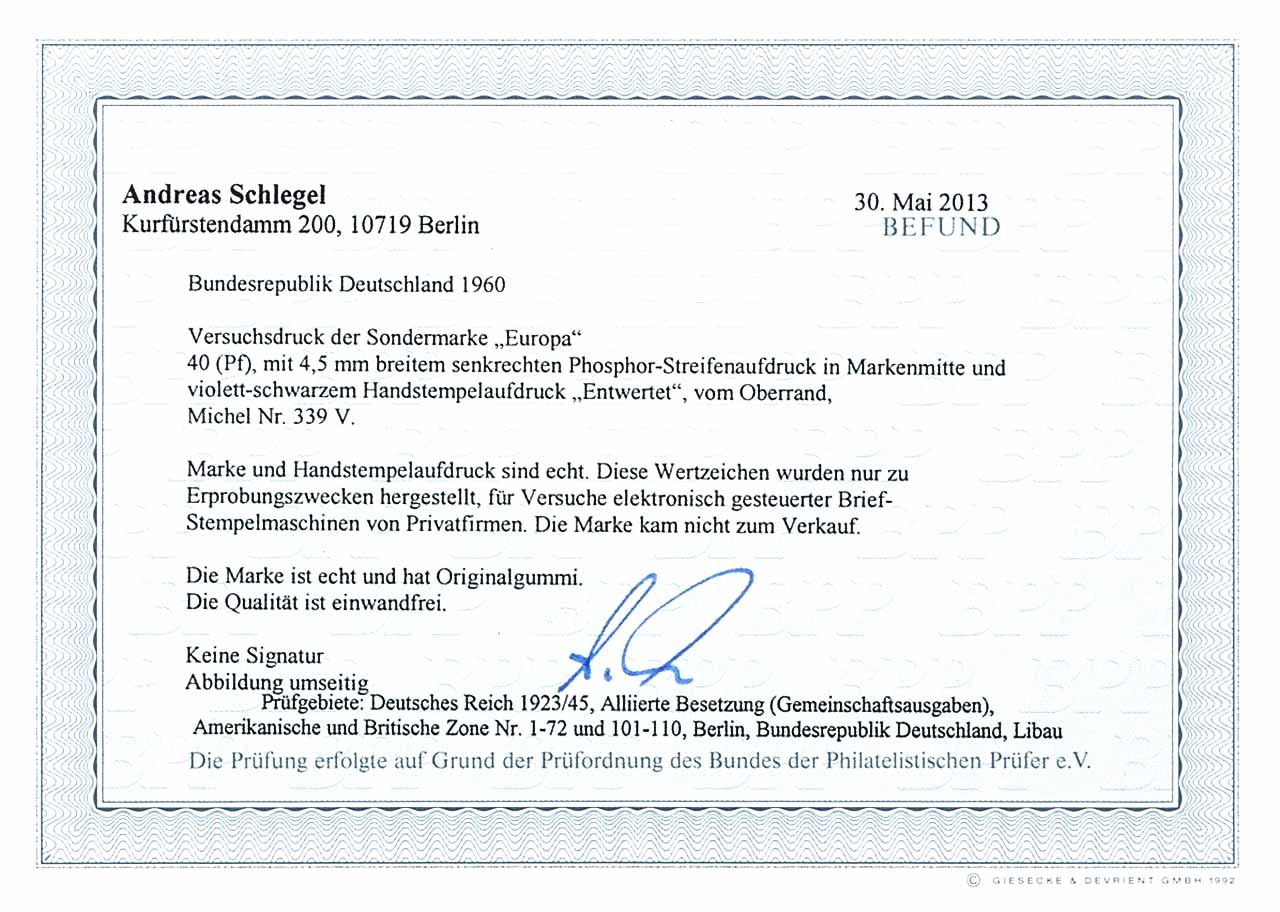 40 Pfg Europa 1960, Versuchsdruck mit 4,5 mm breitem Phosphorstreifenaufdruck und Handstempel "Entwertet", Oberrandstück, tadellos postfrisch, unsigniert, Fotobefund A. Schlegel BPP: "Die Qualität ist einwandfrei", Mi. 600.-