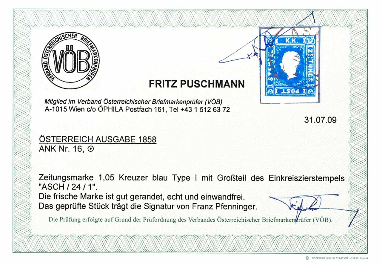 1858, 1,05 Kr. Zeitungsmarke, blau, vollrandig geschnitten, klar gestempelt "ASCH 24/1", Fotobefund Puschmann VÖB: "echt und einwandfrei", Mi. 700.-
