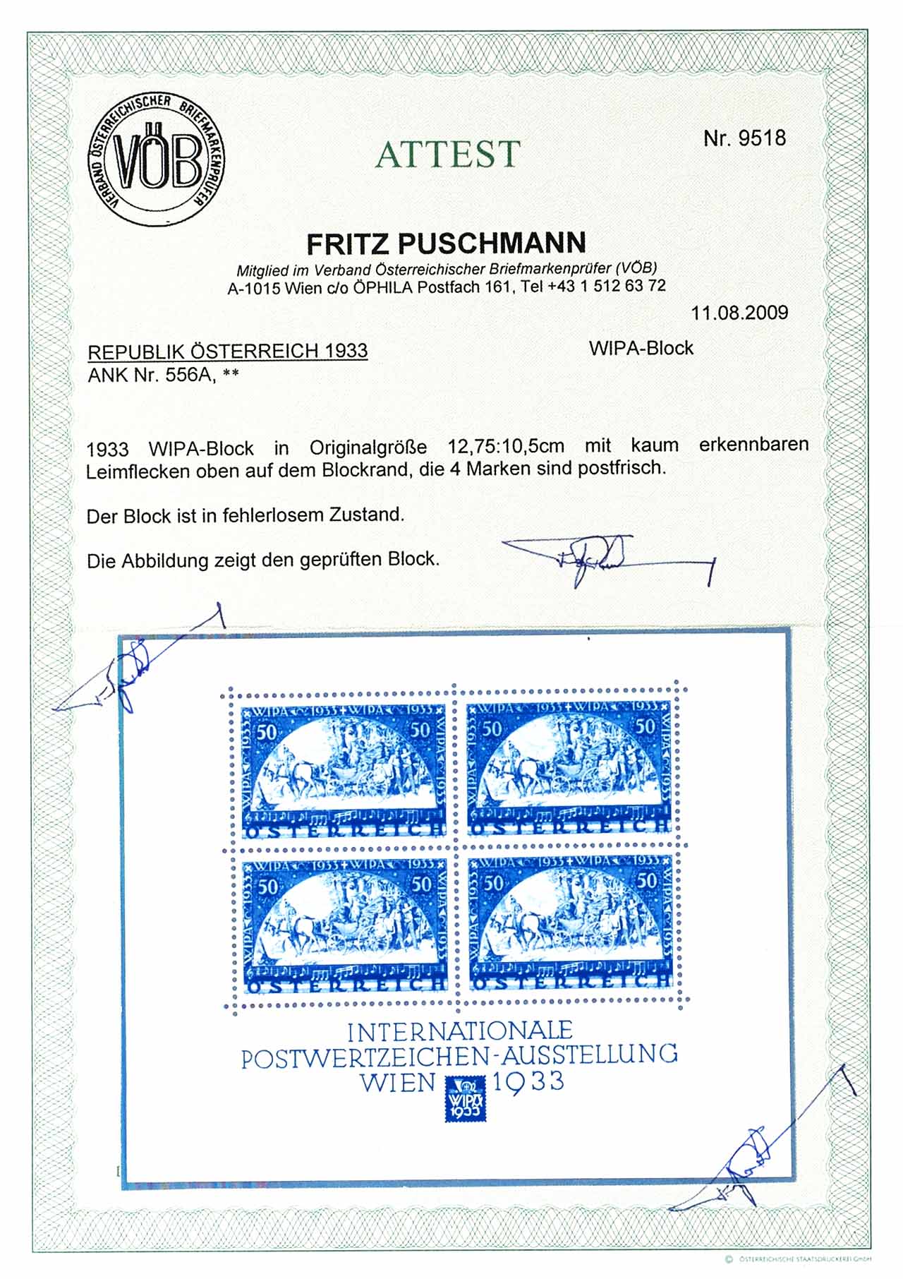 Blockausgabe "Internationale Postwertzeichenausstellung WIPA 1933", tadellos postfrisch mit den üblichen drei Klebepunkten im Blockrand und zugehörigem Umschlag, Fotoattest Puschmann VÖB (2009), Mi. 3.750.-
