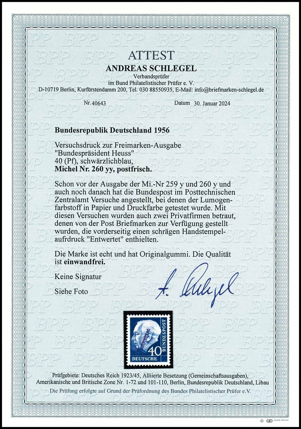 40 Pfennig Heuss auf fluoreszierendem Papier in abweichender Farbe schwärzlichblau mit Handstempelaufdruck "Entwertet", zu Versuchszwecken 1960 hergestellt. postfrisch, tadellose Erhaltung, Fotoattest Andreas Schlegel BPP (2024) "Die Qualität ist einwandfrei.", Mi. 1.000.-