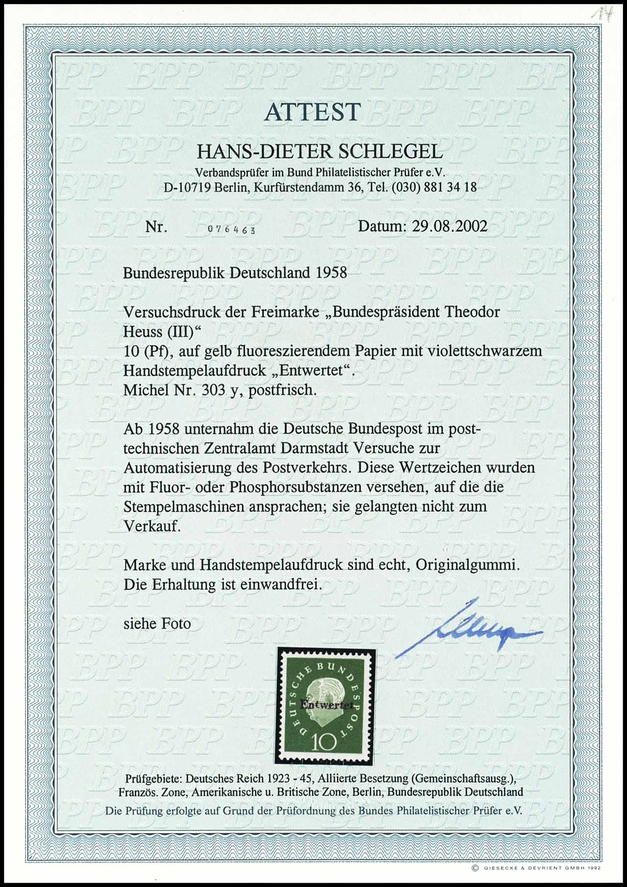 10 Pfennig Heuss (III), Versuchsdruck auf fluoreszierendem Papier, Handstempelaufdruck "Entwertet", postfrisch, tadellose Erhaltung, unsigniert, Fotoattest Hans-Dieter Schlegel BPP "Die Erhaltung ist einwandfrei.", Mi. 500.-