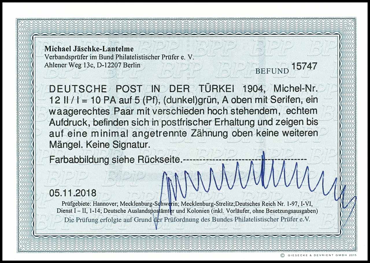 5 Pfennig Germania mit Aufdruck 10 PARA im waagerechten Paar mit verschieden hoch stehendem Aufdruck als Teil einer Neunereinheit vom linken Rand, tadellos postfrisch, Fotoattest Jäschke-L. BPP, Mi. gesamt 840.-