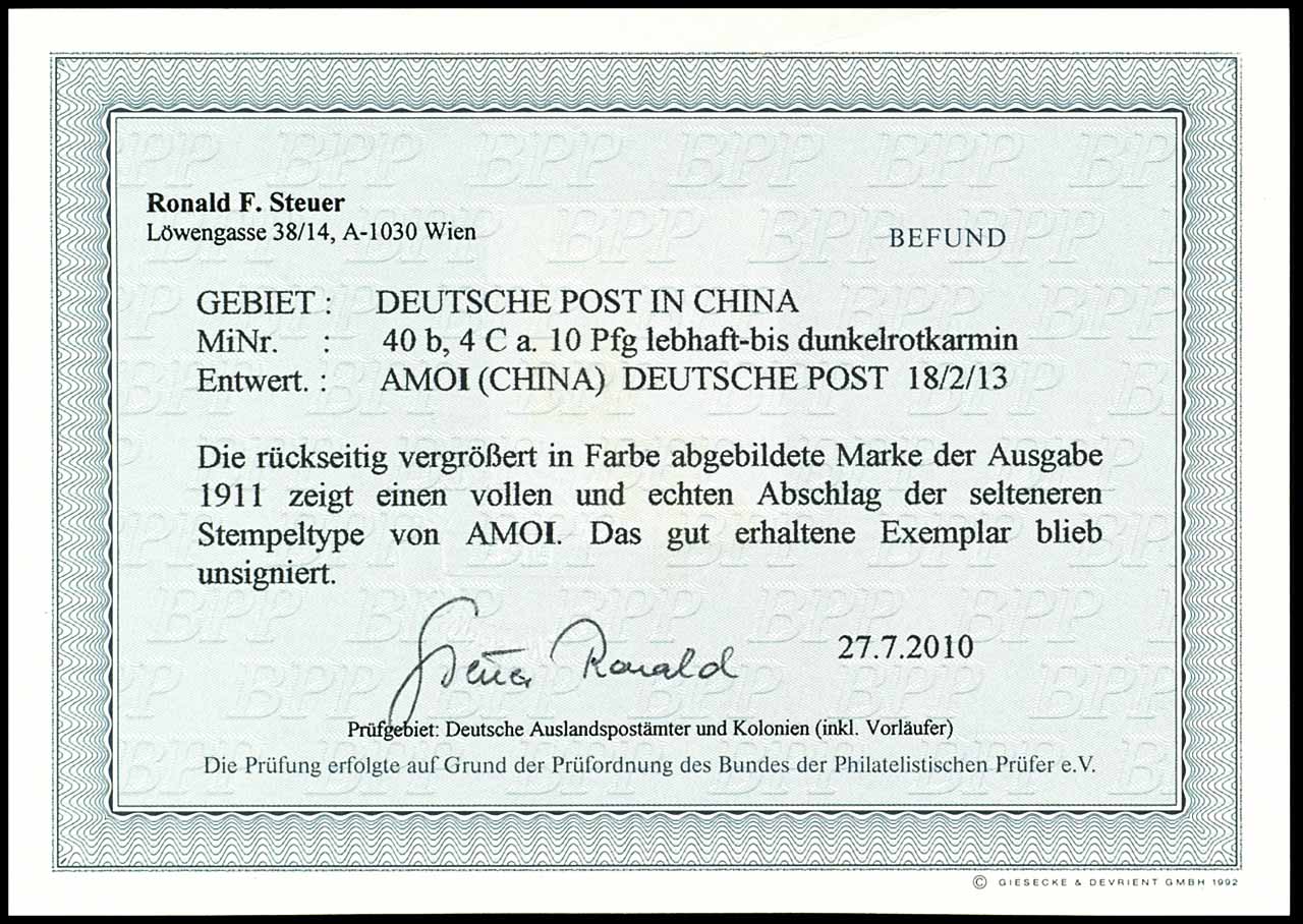 4 C. auf 10 Pfennig Germania dunkelrotkarmin, entwertet "AMOI (CHINA) DEUTSCHE POST 18.12. 13, tadellose Erhaltung, seltenere Stempeltype von AMOI, Fotobefund Ronald F. Steuer BPP