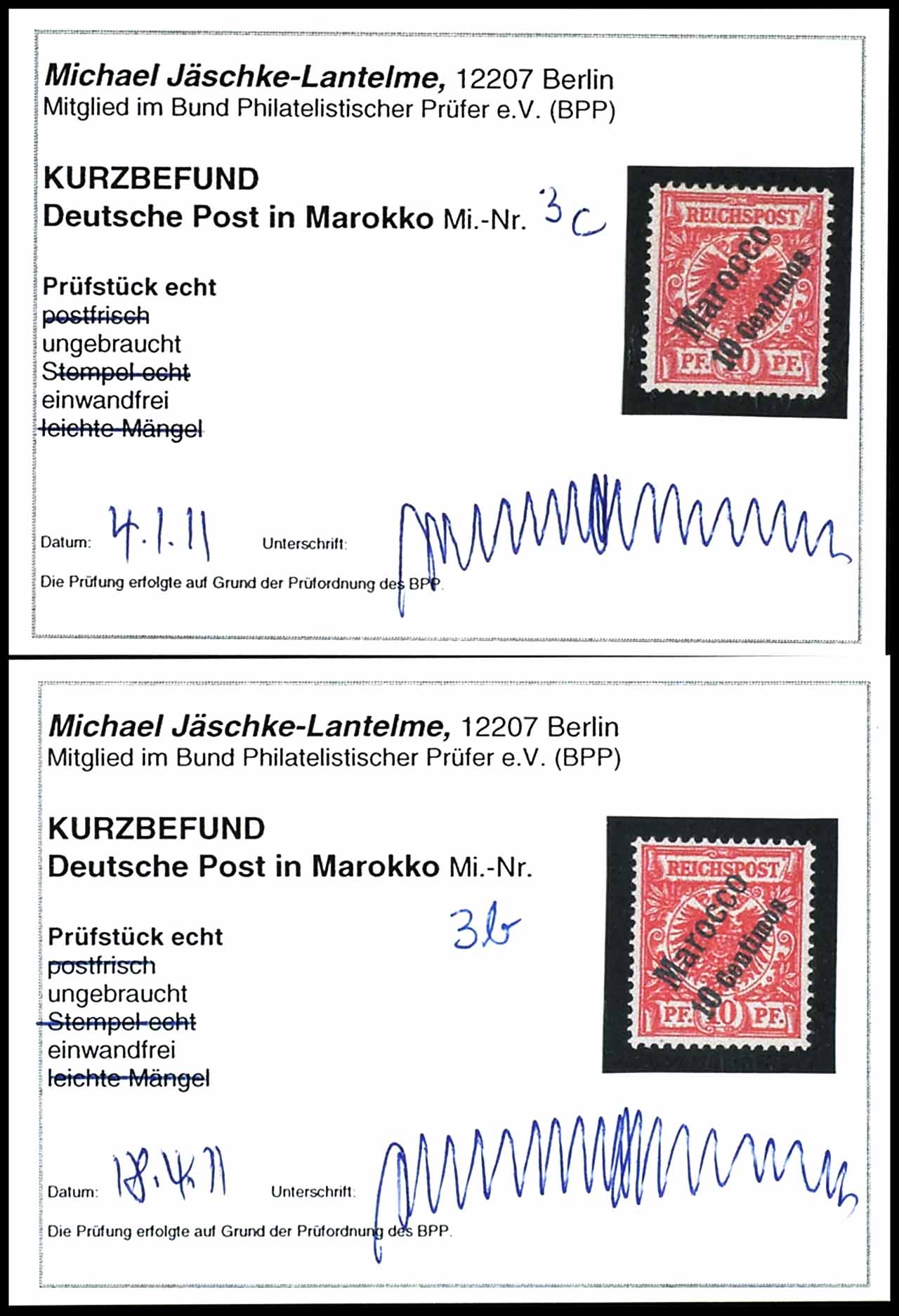 10 Centimos auf 10 Pfennig Krone/Adler dunkelrosarot, UV gelblichorange und 10 Centimes auf 10 Pfg Krone/Adler rotkarmin (dunkelrot quarzend), ungebraucht mit Originalgummierung, tadellose Erhaltung, je Fotobefund Michael Jäschke-Lantelme BPP "einwandfrei", Mi. 370.-