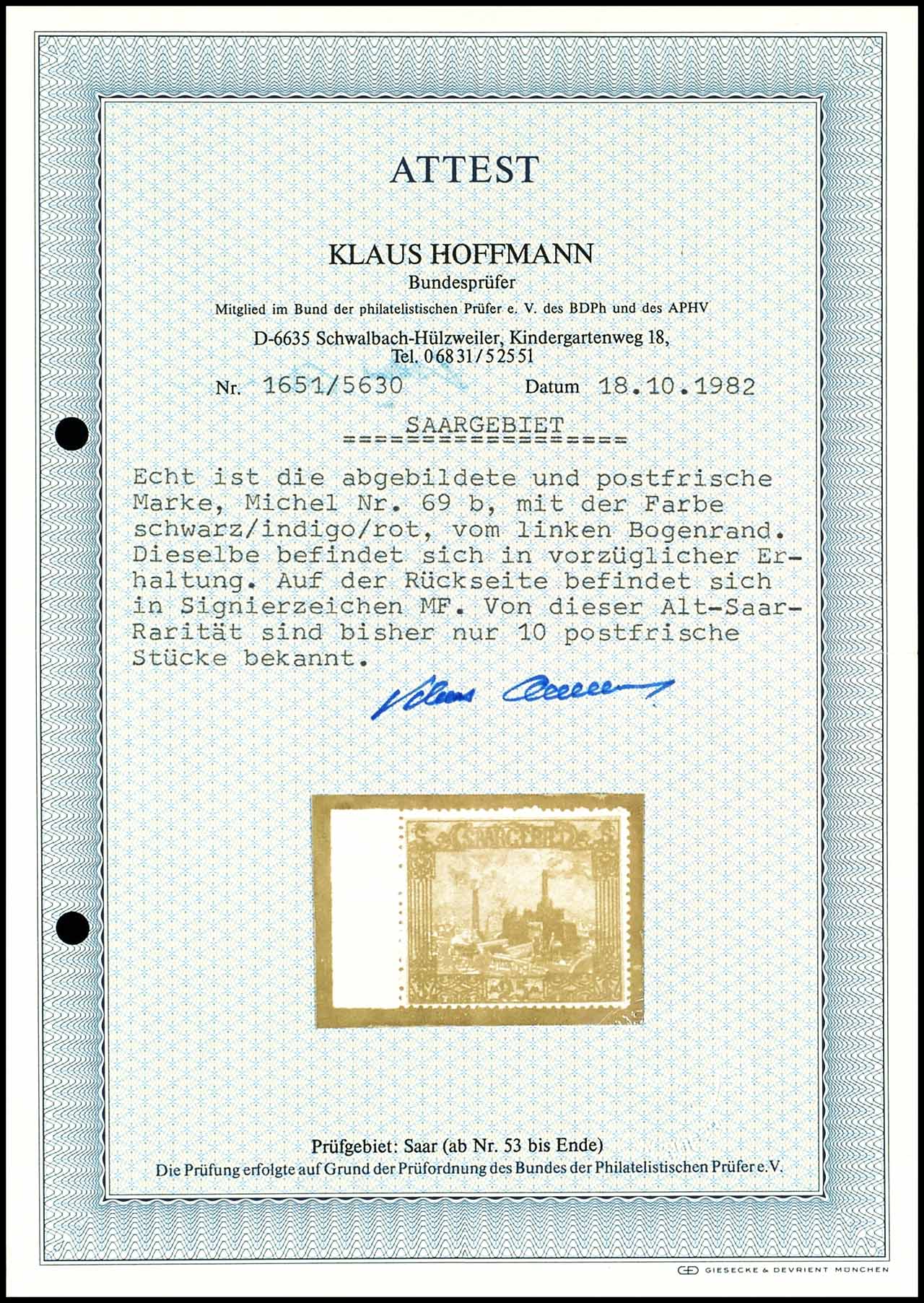 25 Mark schwarz/indigo/rot tadellos postfrisch vom linken Bogenrand. Die Marke war früher als 69b im Michel für teuer Geld katalogisiert und hat dementsprechend ein Fotoattest Hoffmann BPP "postfrisch, in vorzüglicher Erhaltung. Bisher nur 10 postfrische Exemplare bekannt."