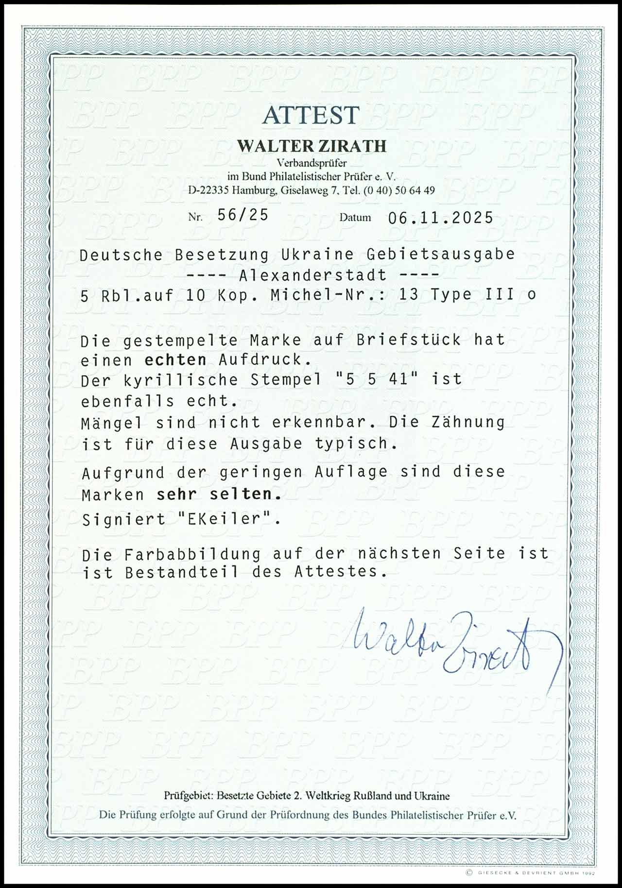1,50 Rbl auf 10 Kopeken Werktätige, Aufdruck in Type II (großes Hakenkreuz), Marke vom Oberrand, gestempelt mit Einzeiler "Alexanderstadt" und stummen Stempel "12 5 42" auf Briefstück, signiert Krischke BPP und Fotoattest Walter Zirath BPP (2025) "Die Erhaltung ist einwandfrei.", Mi. 300.-