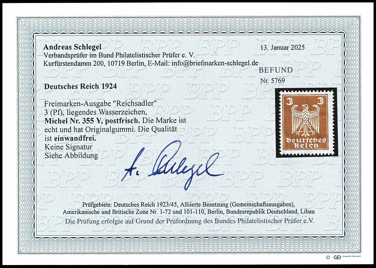3 Pfennig Reichsadler, liegendes Wasserzeichen, postfrisch, tadellose Erhaltung, unsigniert, Fotobefund Andreas Schlegel BPP (2024) "Die Qualität ist einwandfrei.", Mi. 400.-