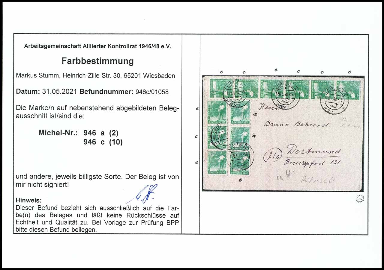 10 Pf. dunkelgelblichgrün (10 Werte) und 2mal 10 Pf. dunkelgelbgrün auf Brief vom 28.6.48 von Leipzig nach Dortmund, das übrige Porto rückseitig mit 6mal 10 Pf., 16 Pf. und 2mal 25 Pf. blieb unentwertet, Bedarfserhaltung, Fotobefund ARGE (Stumm) für 10mal 946c, interessante und seltene Frankatur, Mi. mindestens 1.800.-