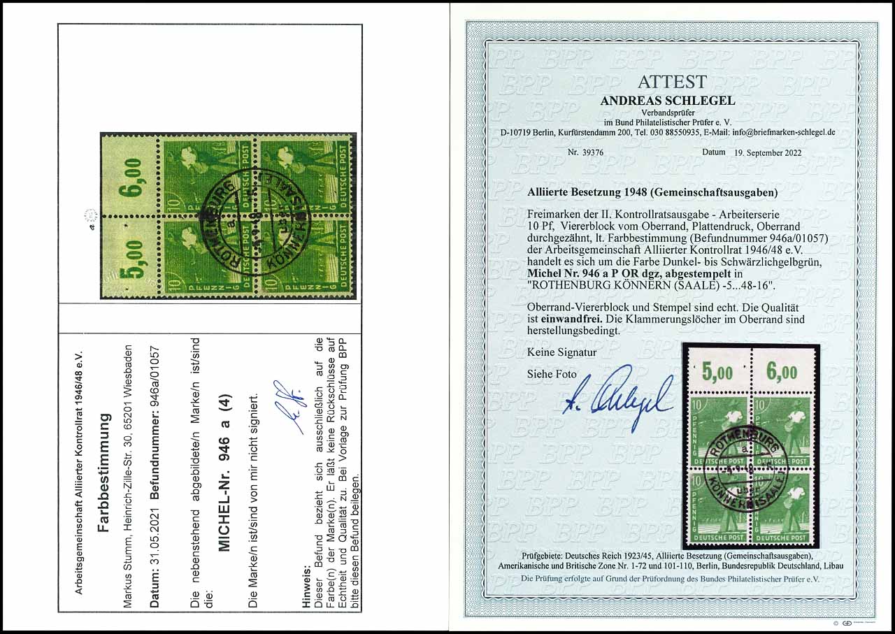 10 Pf. dunkelgelbgrün im 4er-Block vom Oberrand (durchgezähnt), tadellos, gestempelt, Fotobefund ARGE und Fotoattest A. Schlegel BPP "echt und einwandfrei", Mi. 600.-
