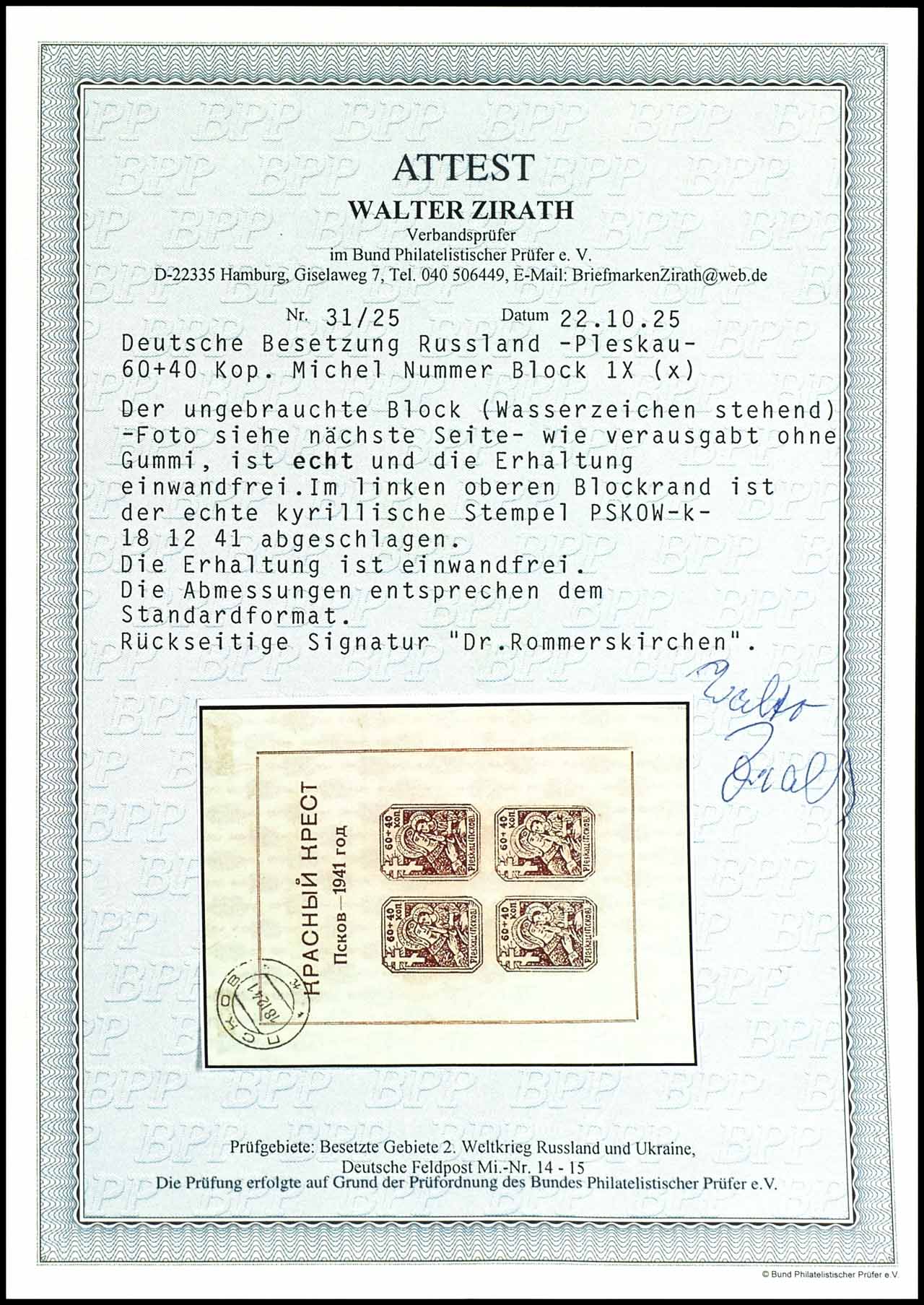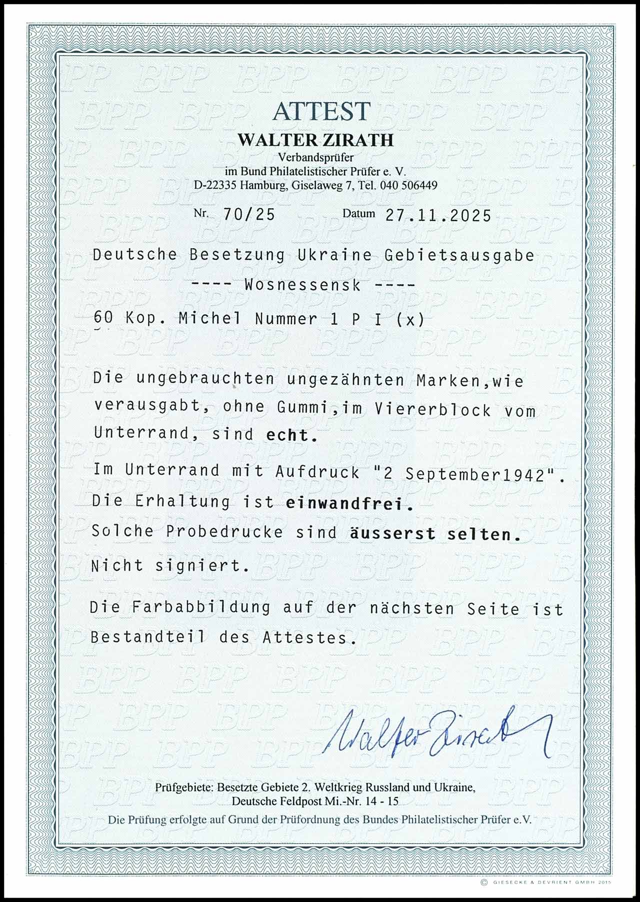 60 Kopecks, imperforated block of four! with overprint "2 September 1942" in the lower margin of sheet, on ungummed, brownish paper! in perfect unused condition, extremely rare! unsigned, photo expertize Walter Zirath BPP (2025) : ". the condition is perfect. those trial proofs are extremely rare. Michel 2.000.- plus plus