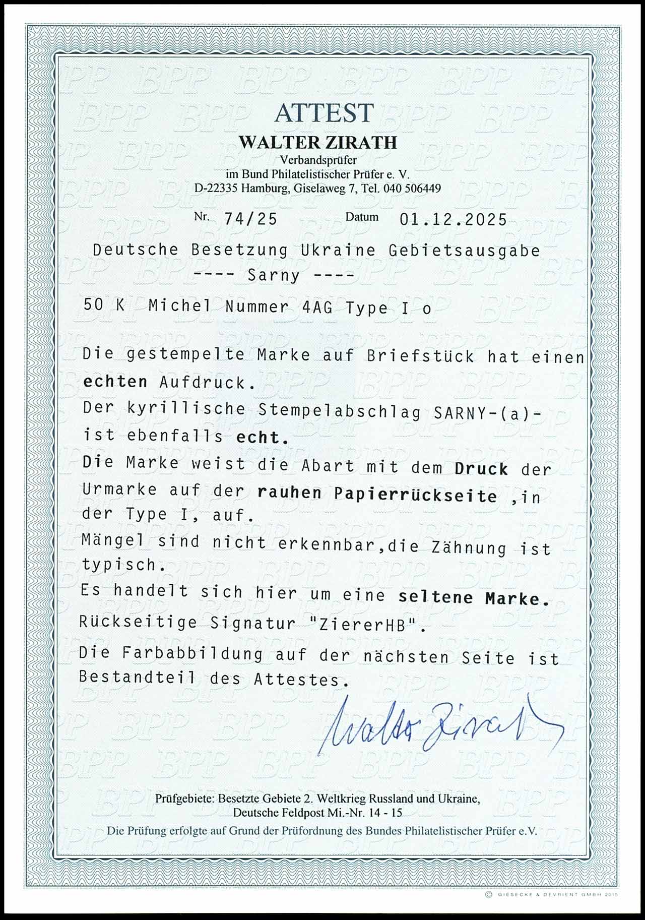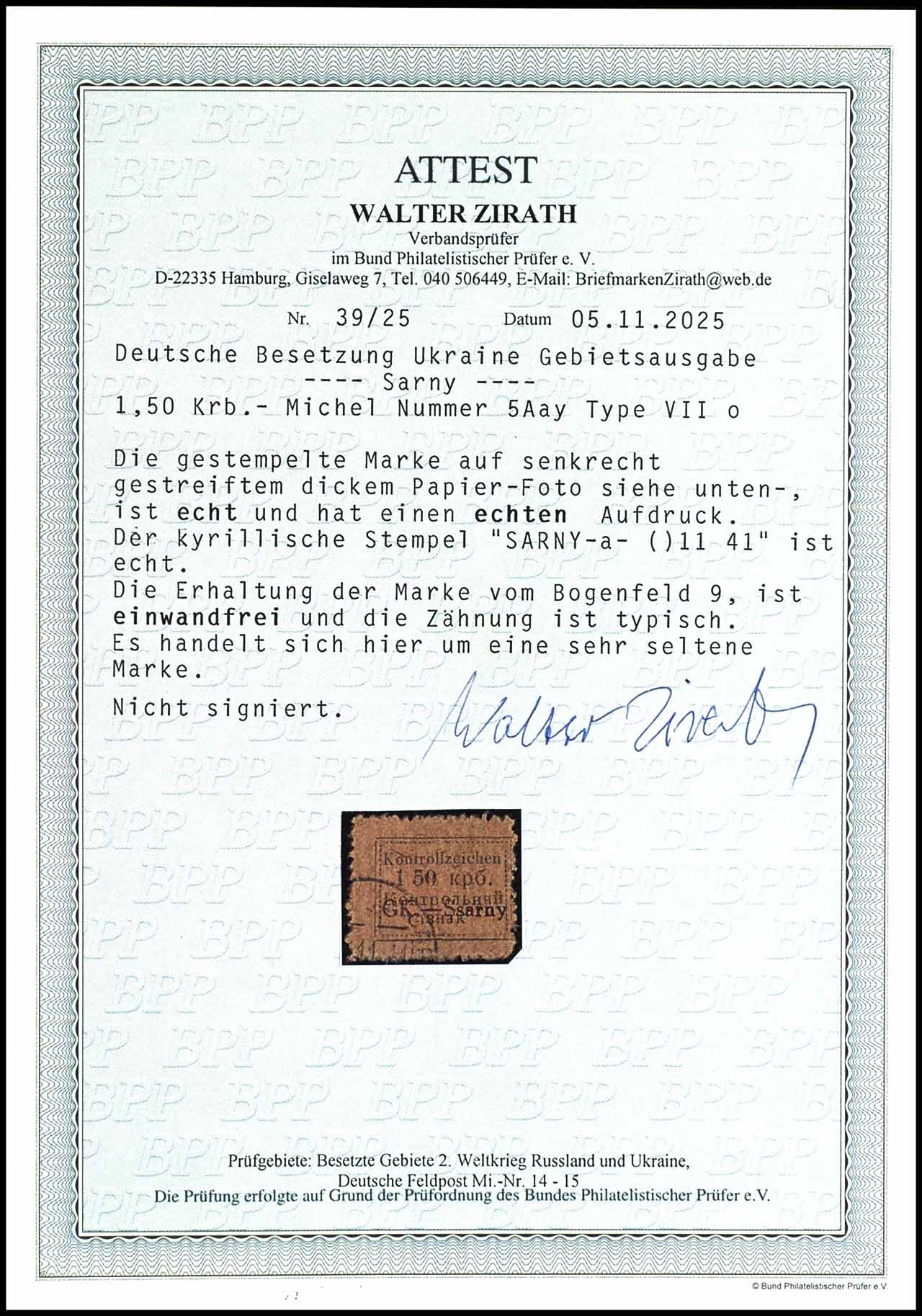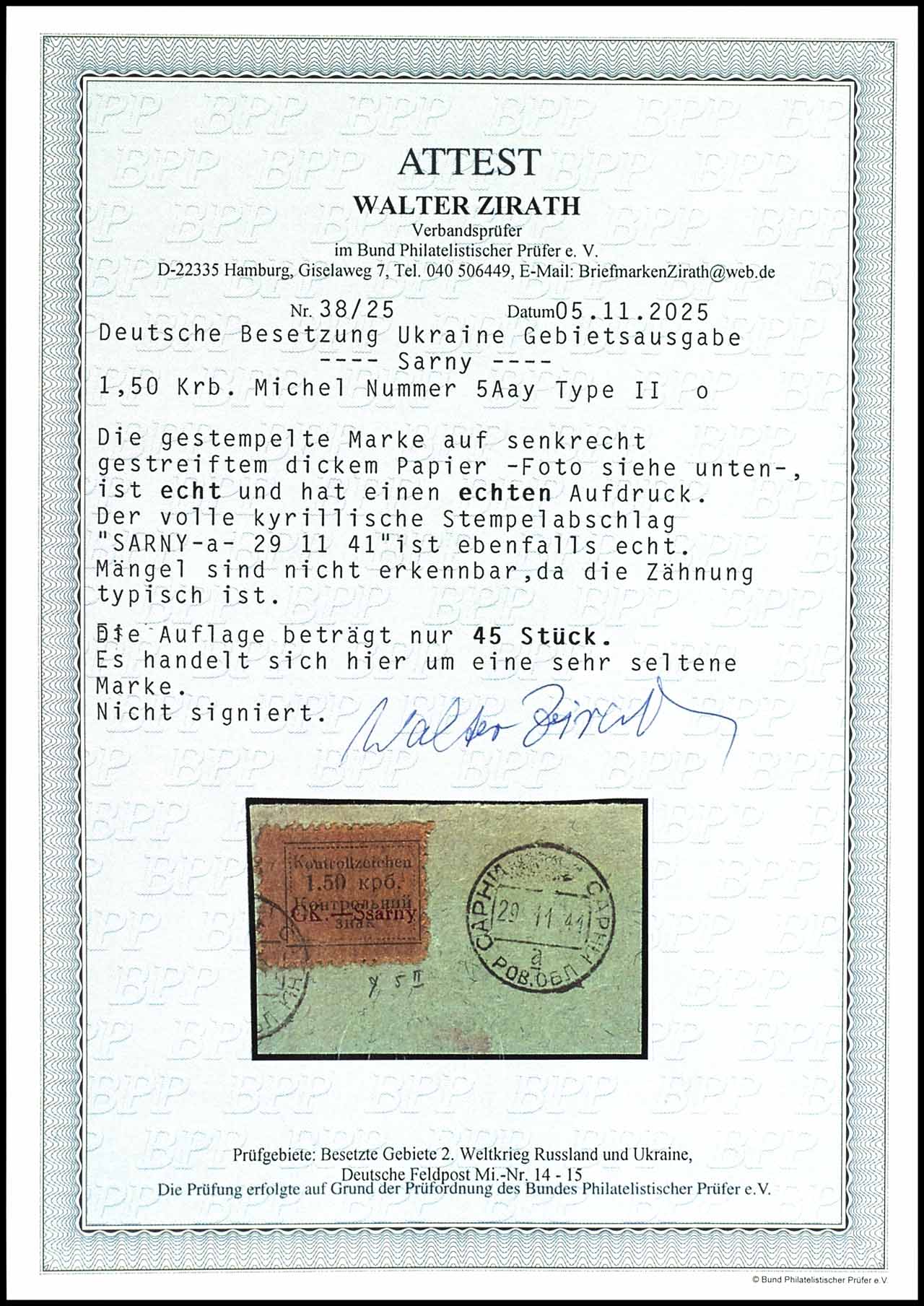 1, 50 Karbowanez medium ochre-brown on vertical roveed thick paper, type II, on decorative letter piece, right with full Cyrillic cancel "SARNY a 29 11 41", issue typical perforation, signed Krischke BPP and photo expertize Walter Zirath BPP (2025) ". defects are indistinguishable, because the perforation is typical. this is a very rare stamp. " Michel 3.300.- a rare stamp.