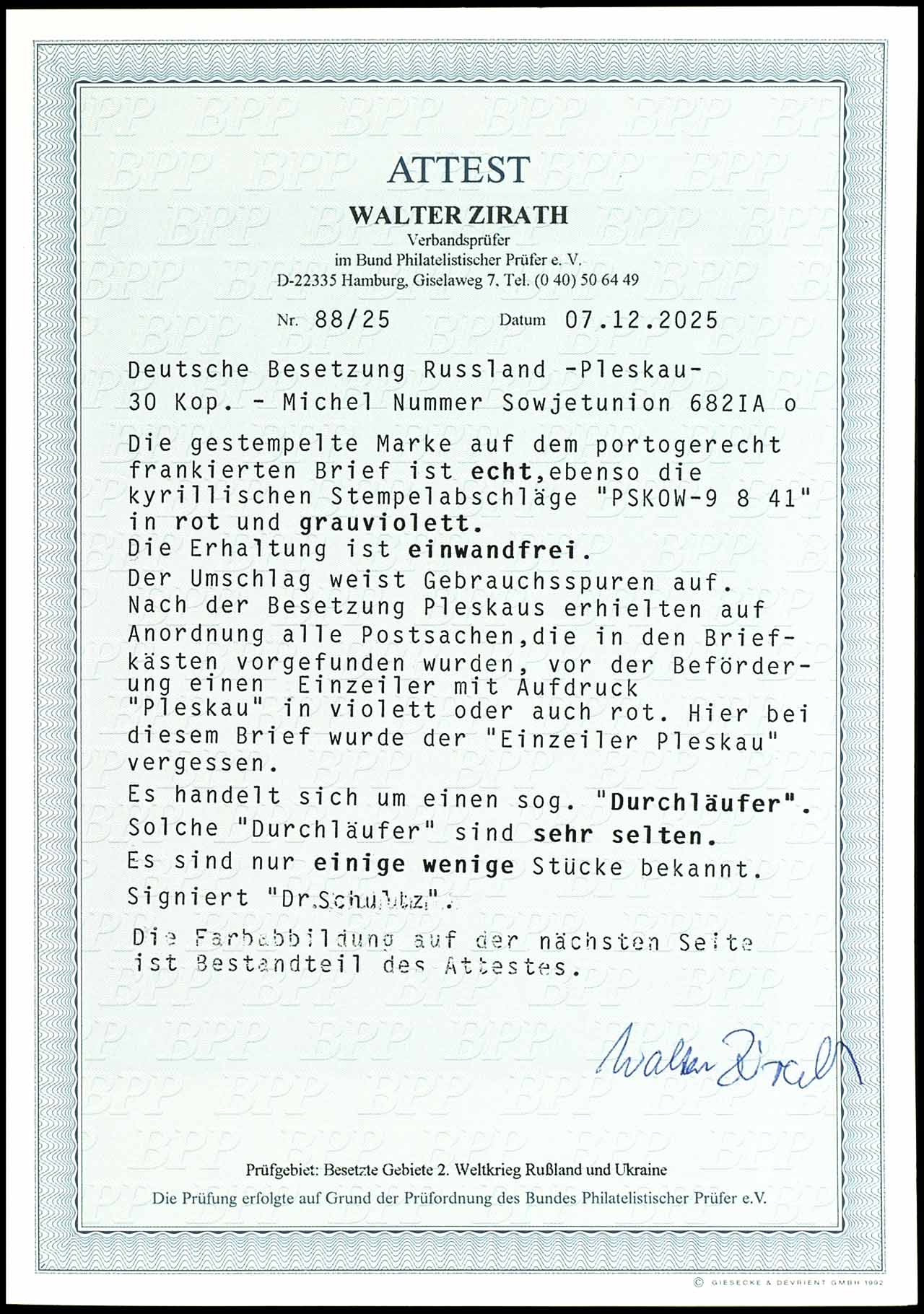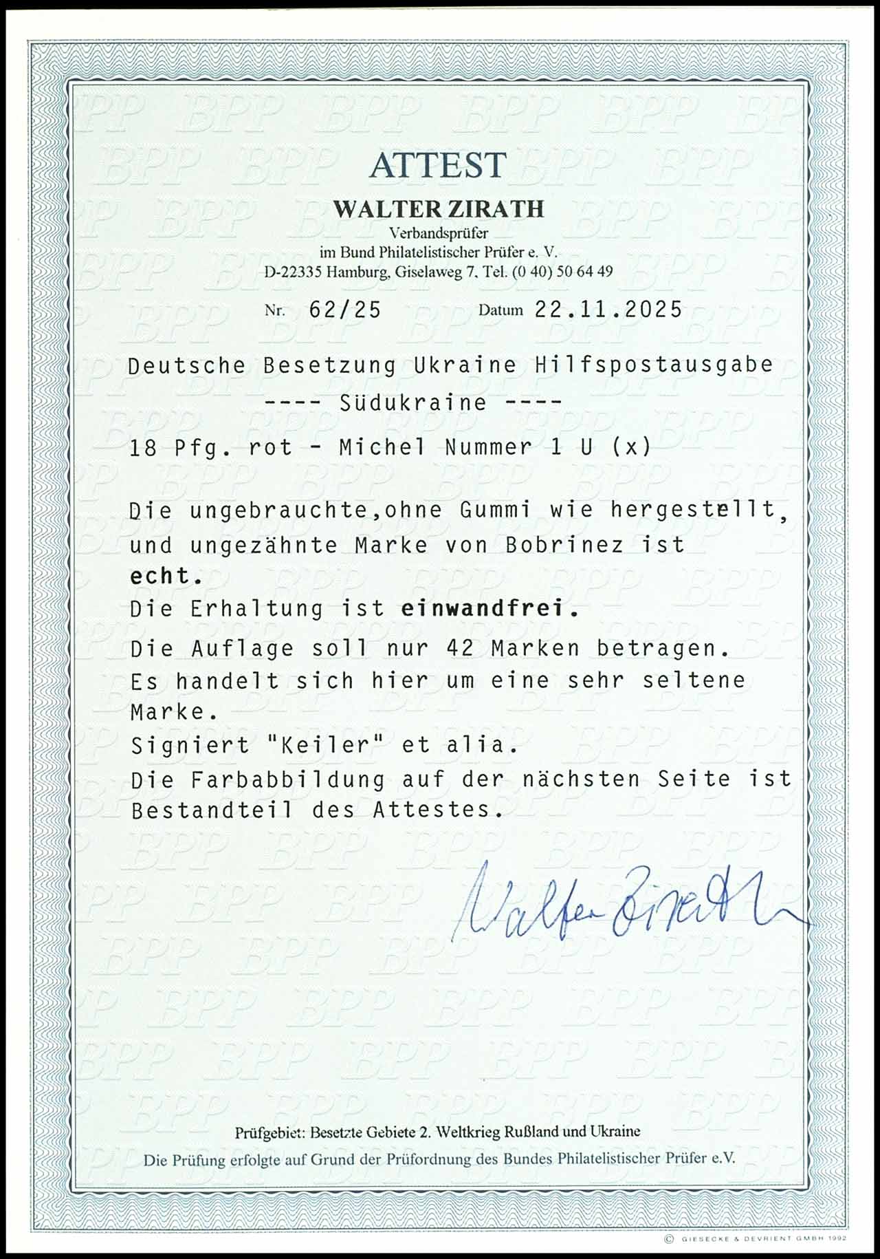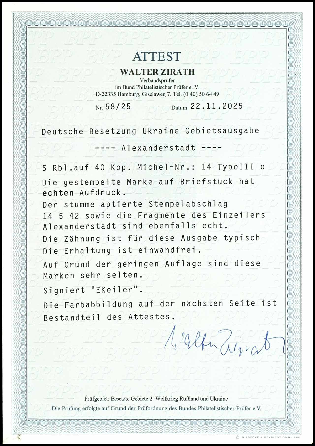 1, 50 Karbowanez medium ochre-brown on vertical roveed thick paper, type II, on decorative letter piece, right with full Cyrillic cancel "SARNY a 29 11 41", issue typical perforation, signed Krischke BPP and photo expertize Walter Zirath BPP (2025) ". defects are indistinguishable, because the perforation is typical. this is a very rare stamp. " Michel 3.300.- a rare stamp.
