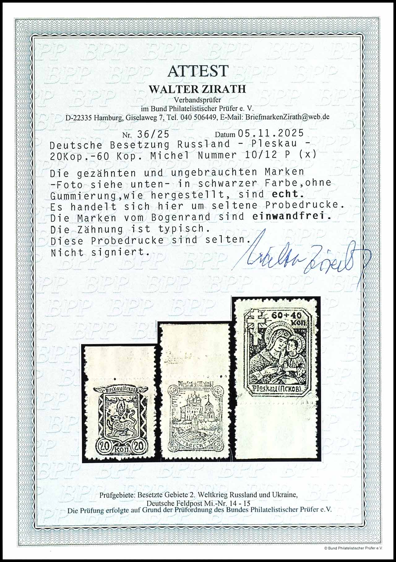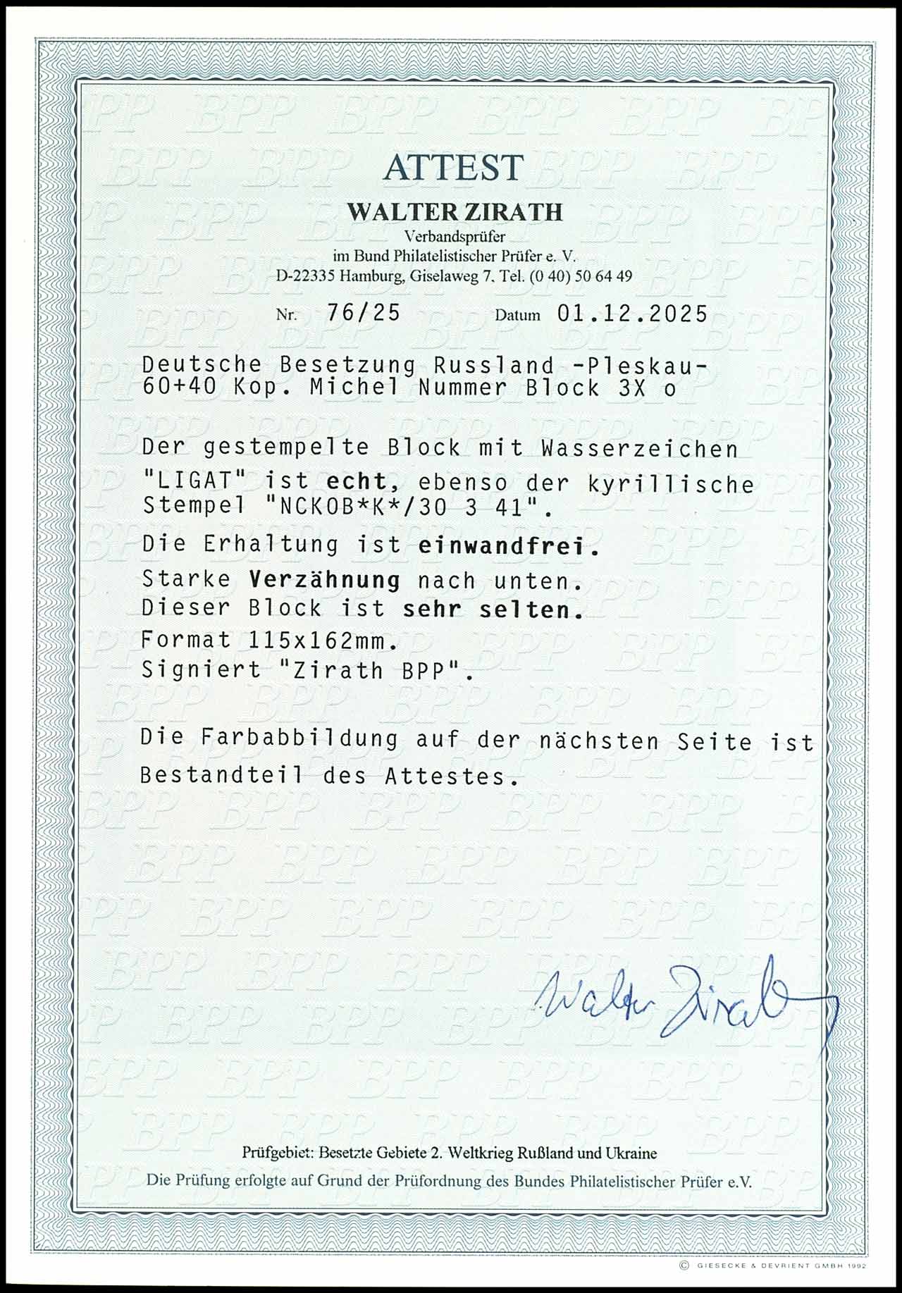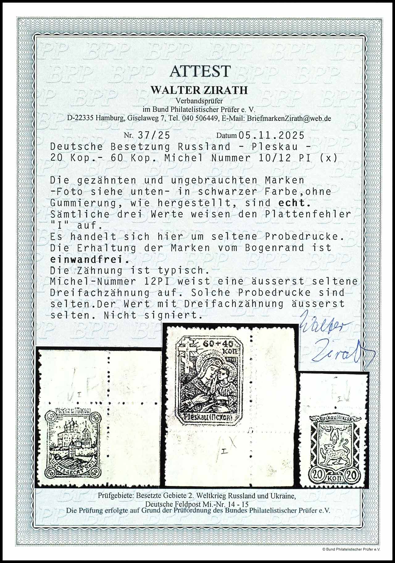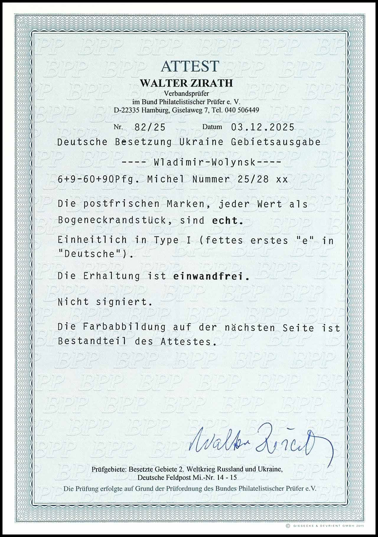 6 plus 9 pfennigs to 60 plus 90 pfennigs Vladimir Wolynsk, unused without gum - as issued, Michel number 12 from position 15 with plate flaw III "short right flank of the W in Wolynsk", Michel number 15 from position 4 with plate flaw II " small d in Vladimir", very fine, the partly grobe and irregular perforation is manufactured, signed Pickenpack BPP, the Michel number 13-15 also signed E wild boar, the total edition trick -ish 250 sets, expertise Robert Brunel VP (2025) "the condition is perfect", Michel 1.000.-