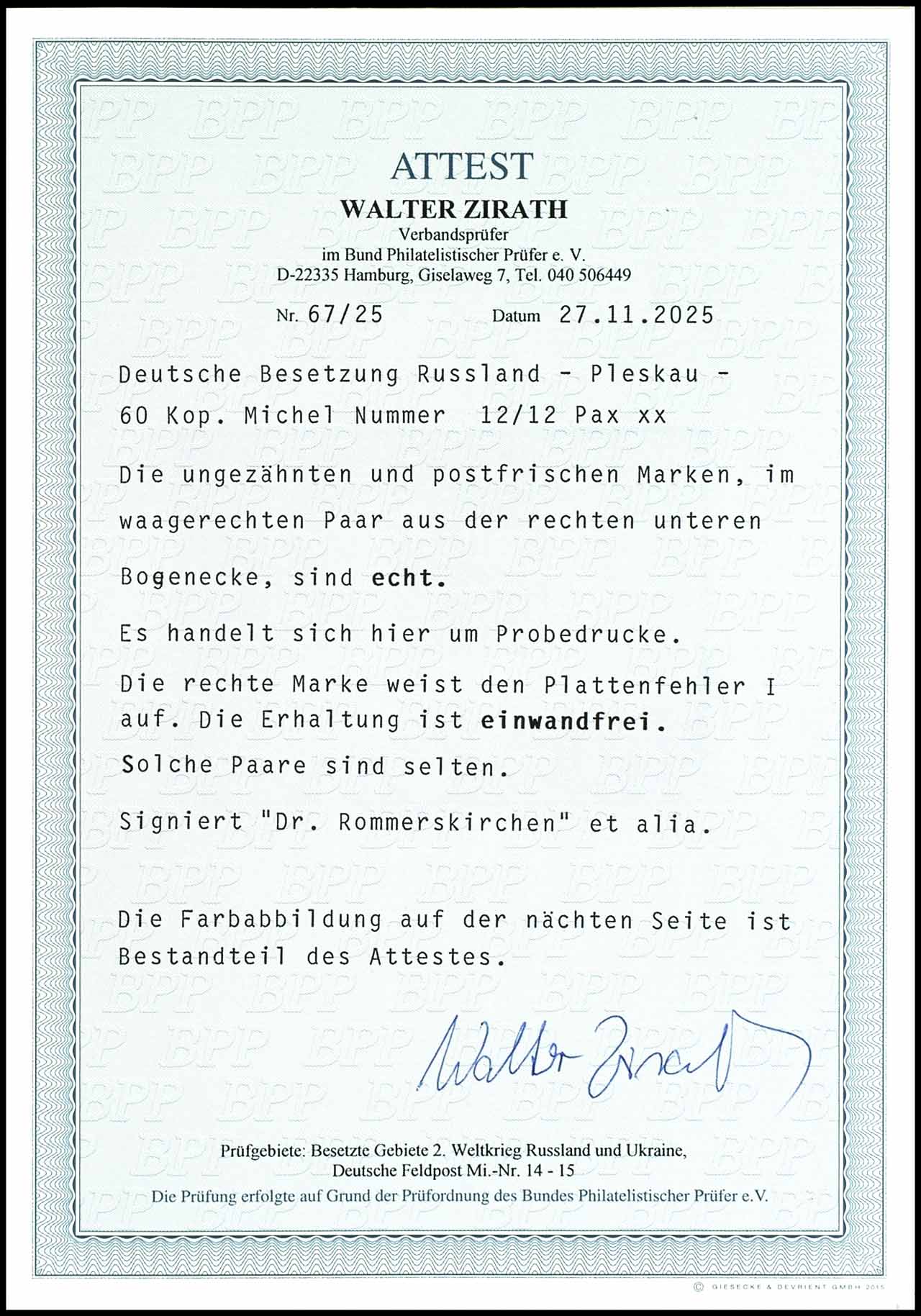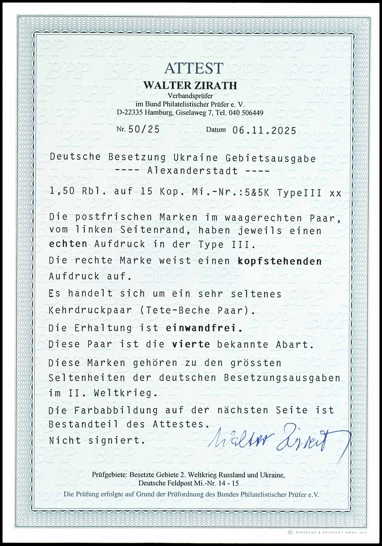 50 Kopecks black on dark gray blue, imperforated, horizontal pair with stamps in type I and VII, positions 8 / 9 with complete overprint "proof print", as issued unused without gum, the right stamp from position 9 point at the composition error VII on which just once in the sheet occurs, the edition of the left stamp from position 8 in type I amounts 15 examples, therefore places the horizontal pair a unique piece dar and is one of the largest rarities of the German occupation issues in the II. world war, signed Z. Mikulski and photo expertize Walter Zirath BPP "the condition is perfect. ", Michel 36.000.-