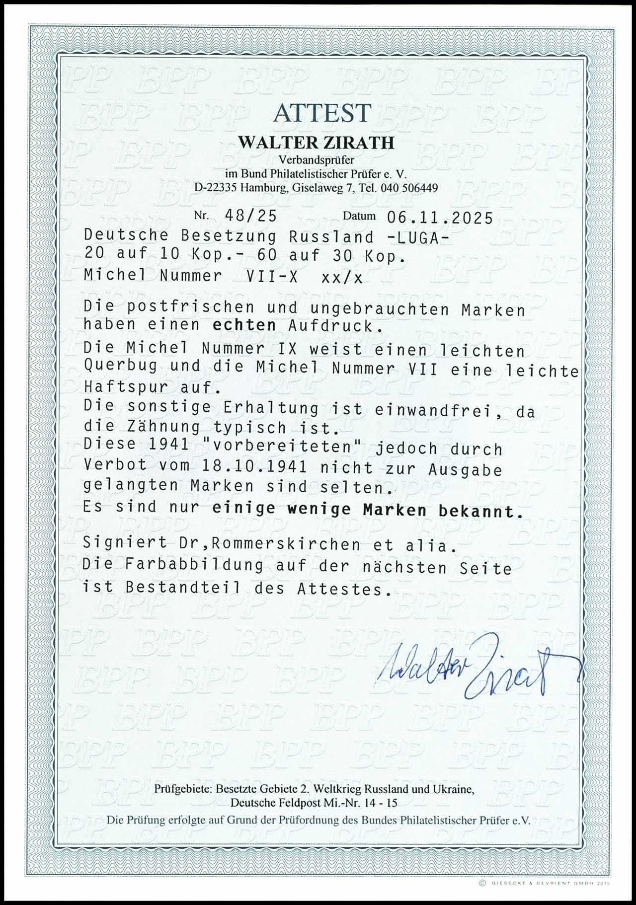 6 pfennigs to 60 pfennigs provisional stamps Vladimir Wolynsk, imperforated on linen paper! it is the not to the issue arrived execution the later second issue (Michel number 25-28), uniform from right margin of sheet (position 6), unused without gum as produced, this set places a great rarity of the area dar, edition each denomination value approximate only one sheet to 15 stamps, unsigned, photo certificates Gerhard Krischke (2002) and Walter Zirath BPP (2025) "the condition is perfect. ", Michel 7.000.- (undervalued) .