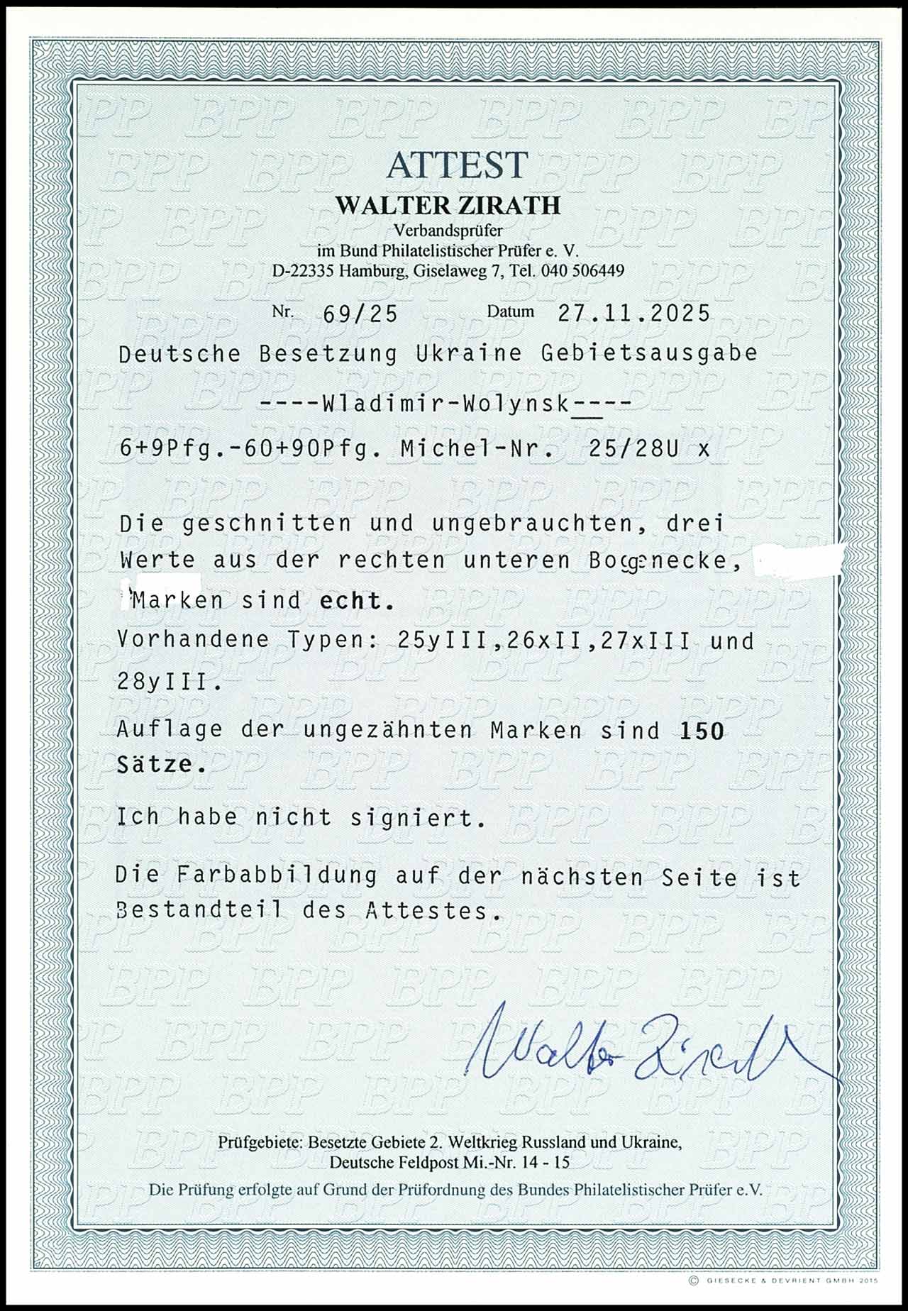 6 Pfg to 60 Pfg Auxiliary postal service Vladimir Wolynsk, imperforated, complete set, three stamps from of the right lower corner of the sheet, following types are is existing Michel number 25 Uy III, 26 crossed II, 27 crossed III and 28 Uy III, in unused condition, issued only 150 sets! signed Krischke BPP (Michel number 26 signed Richter) and photo expertize Walter Zirath (2025) " original gum with affixed spots. edition the imperforated stamps are 150 sets. ", Michel 1.300.-
