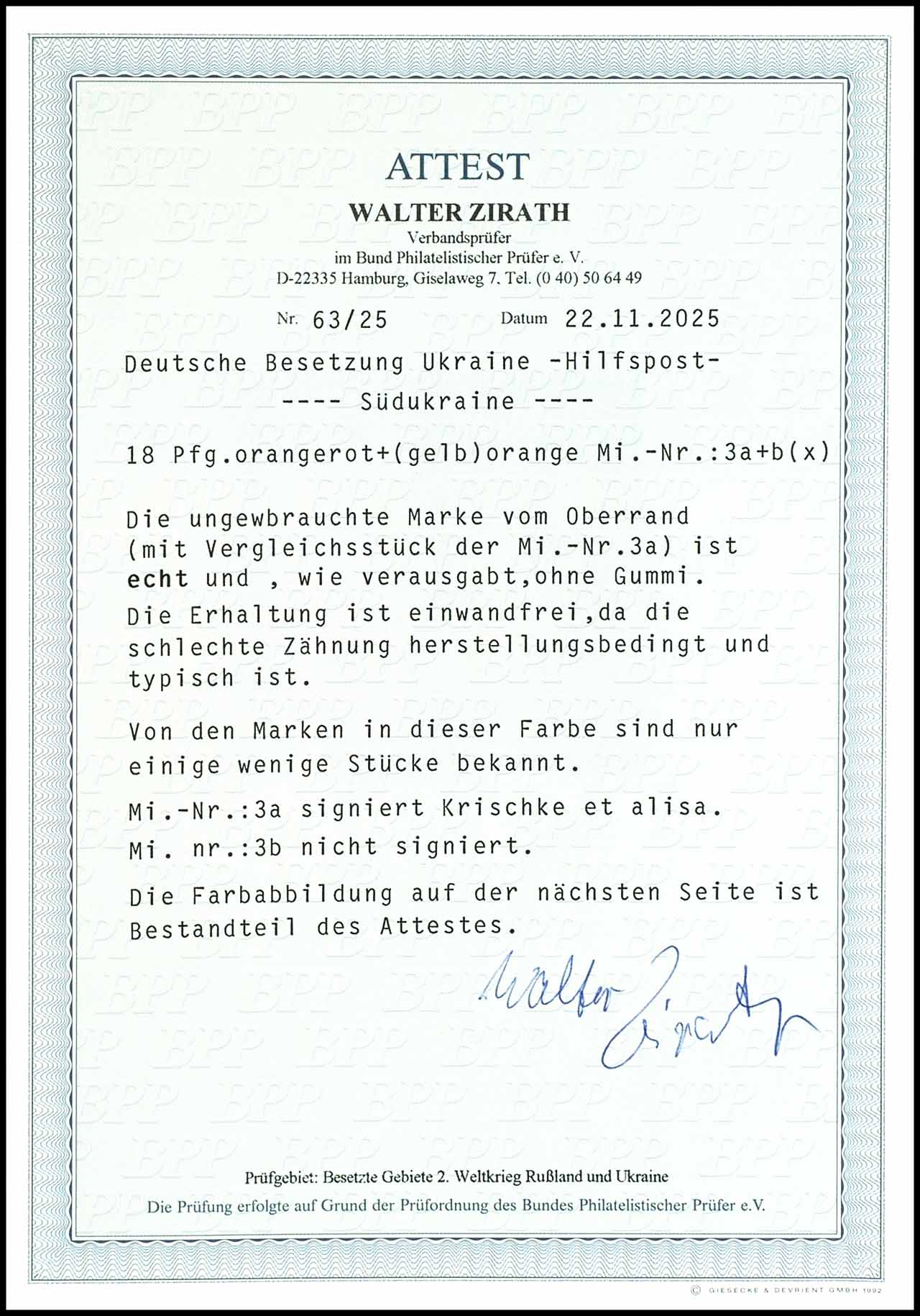 18 pfennigs Dollinska, in both colours yellowish red and lebhhaftorange the colour bright orange is very rare, upper margin copies, unused without gum - as issued, very fine, Michel number 3 a signed Krischke et alia, Michel number 3 b unsigned with photo certificate Walter Zirath BPP (2025) : " the condition is perfect, because the perforation is typical. of the 3 b are only a few stamps known. ". Michel - .