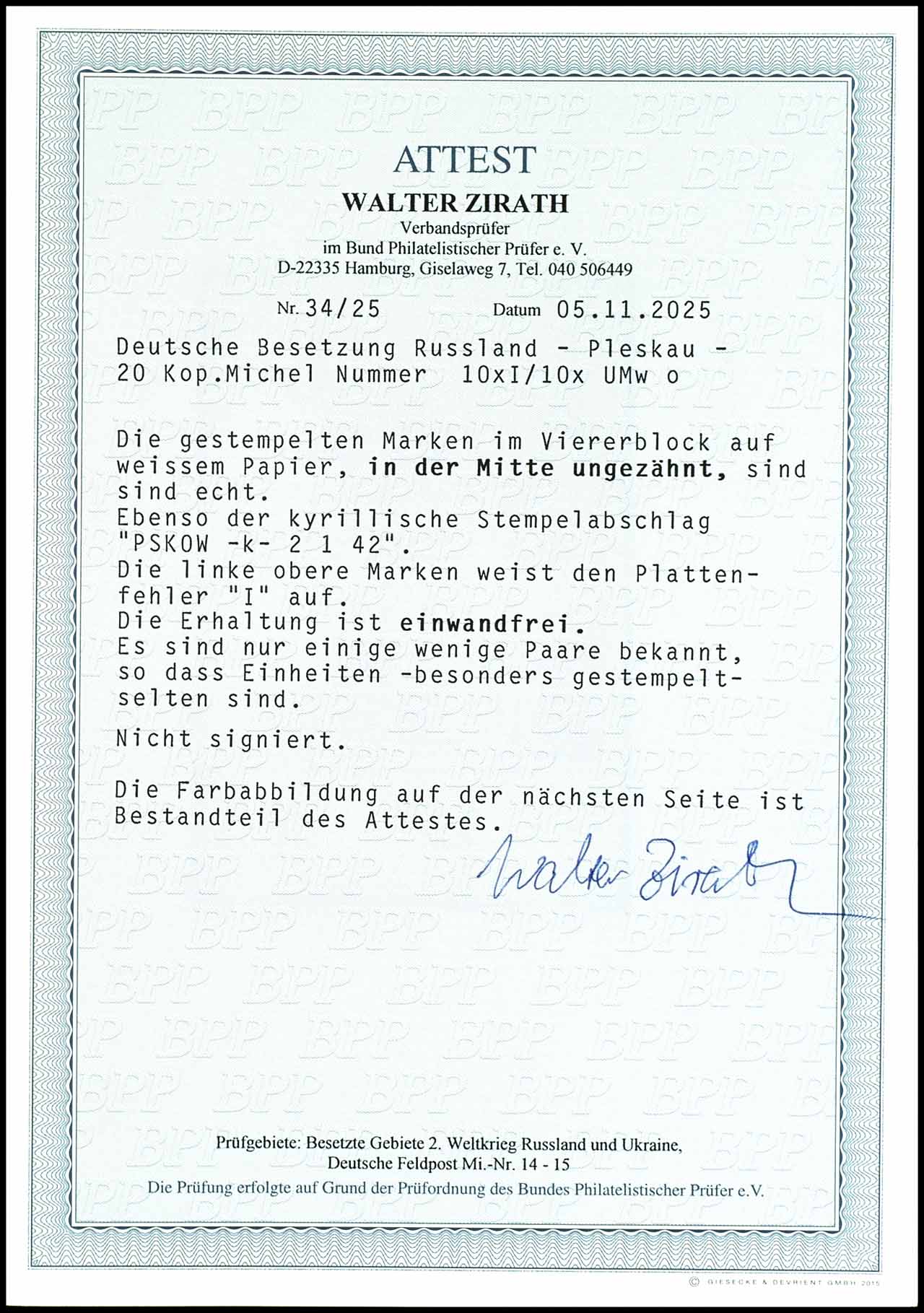 1, 50 Karbowanez postal stamp, from right margin of sheet (field 15), type II, as produced unused without gum, in perfect condition, this is a extreme rarely proof print with overprint (Pro) bendruck, unsigned, expertise Gerhard Krischke BPP "the condition is perfect, because the bad perforation manufactured is. such trial proofs are due to your small edition very rare. ", Michel - .
