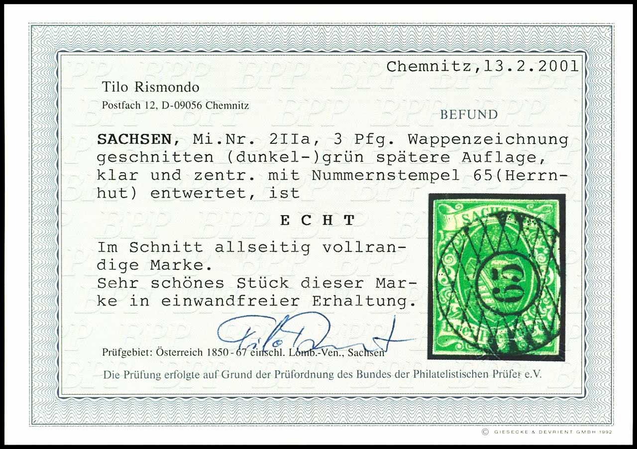 3 pfennigs dark green, later edition, having full margins and fresh colours outstanding quality, cancelled by numeral postmark "65" - in present quality an exception copy, photo expertize Tilo Rismondo BPP "in perfect condition. "
