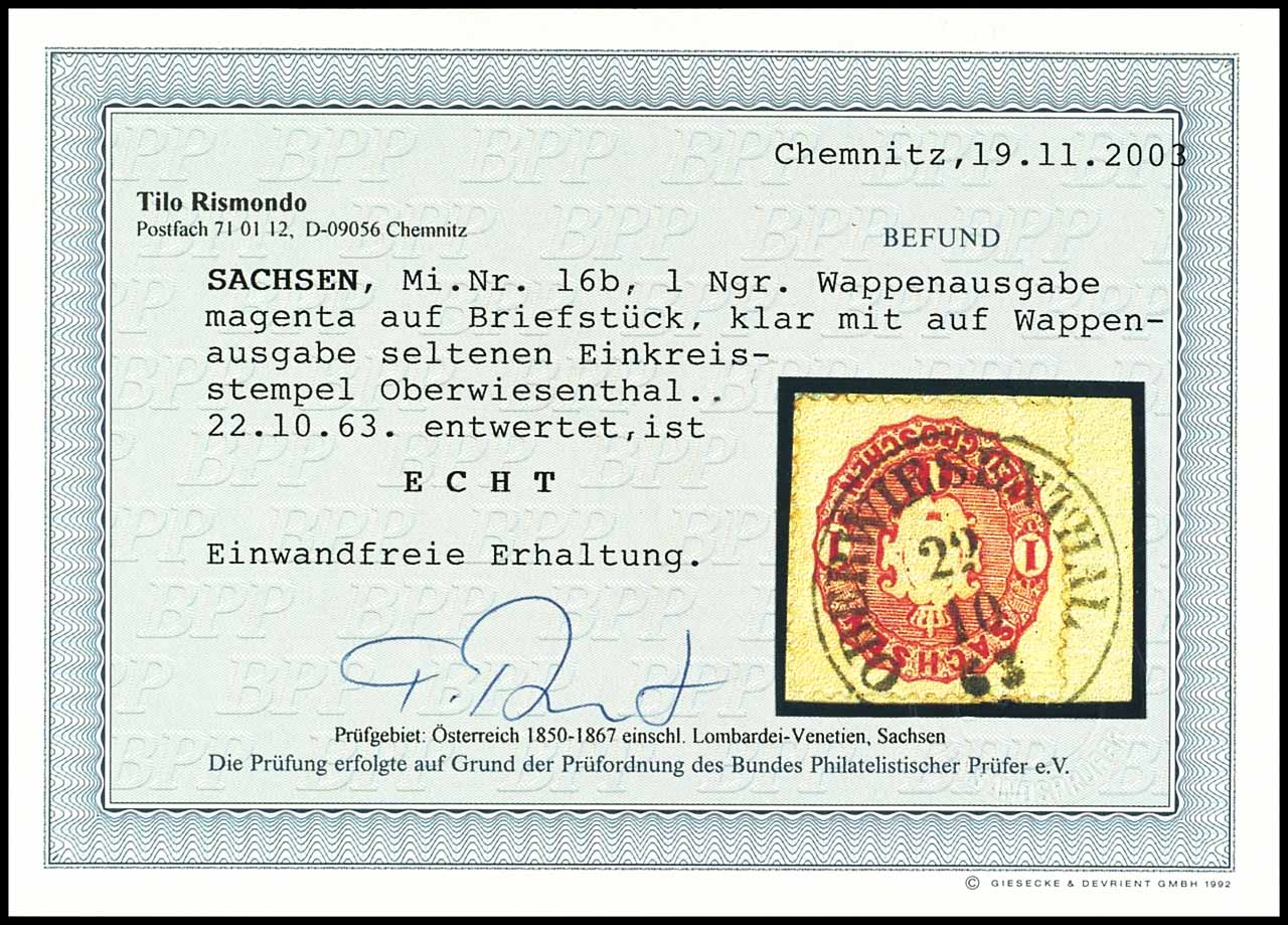 1 Neugroschen crest issue magenta, fresh colours and perfect perforations extremely fine copy, cancelled by on this issue rare single circle postmark "OBERWIESENTHAL 22.10.63" on piece, photo expertize Tilo Rismondo BPP "perfect quality. "