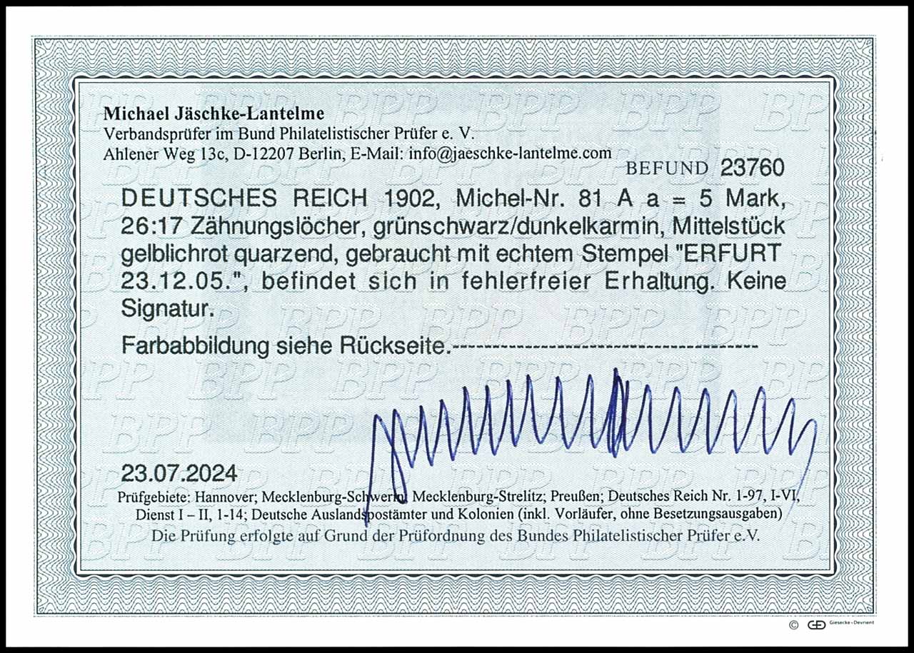 5 Mark German Reich, green black / dark carmine (centerpiece UV yellowish red), 26 : 17 perforation holes, cancelled "Erford 23.12.05", very fine, unsigned, photo expertize Michael Jaeschke Lantelme BPP (2024) "in perfect condition. ", Michel 450.-