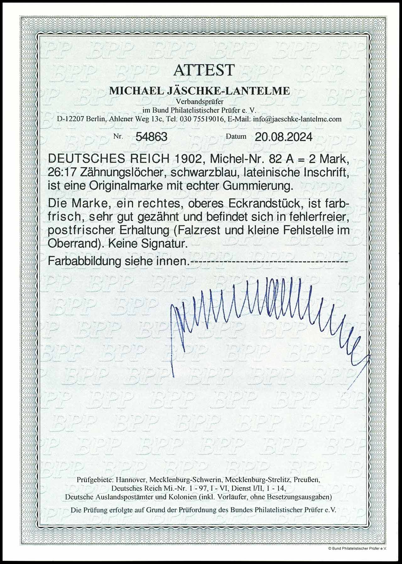 2 Mark German Reich, black blue, 26 : 17 perforation holes, Latin inscription, corner margin piece top right (margins defects), stamp perfectly mint never hinged, unsigned, photo expertize Michael Jaeschke Lantelme BPP (2024) : "fresh colours, very well perforated. in faultless, mint never hinged condition. ", Michel 500.-