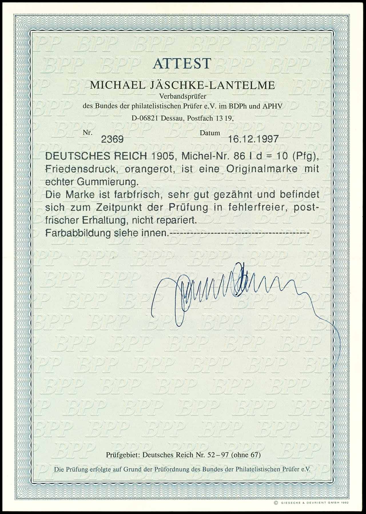 10 pfennigs Germania, orange red, peace printing, mint never hinged, very fine, unsigned outstanding quality, photo expertize Michael Jaeschke Lantelme BPP " fresh colours, very well perforated. in faultless, mint never hinged condition. ", Michel 500.-