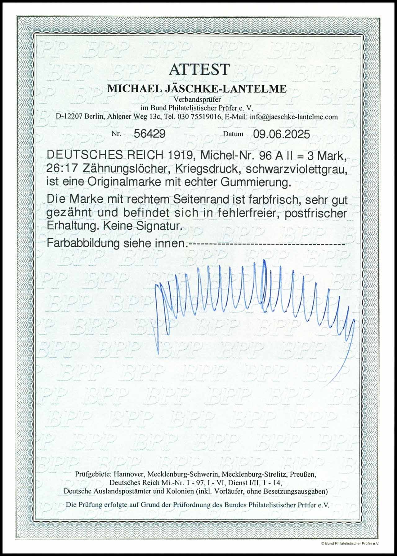 3 Mark German Reich, 26 : 17 perforation holes, war time printing, black violet gray, from right margin of sheet, mint never hinged, very fine, unsigned, photo expertize Michael Jaeschke Lantelme BPP (2025) "fresh colours, very well perforated. in faultless, mint never hinged condition. ", Michel 900.-