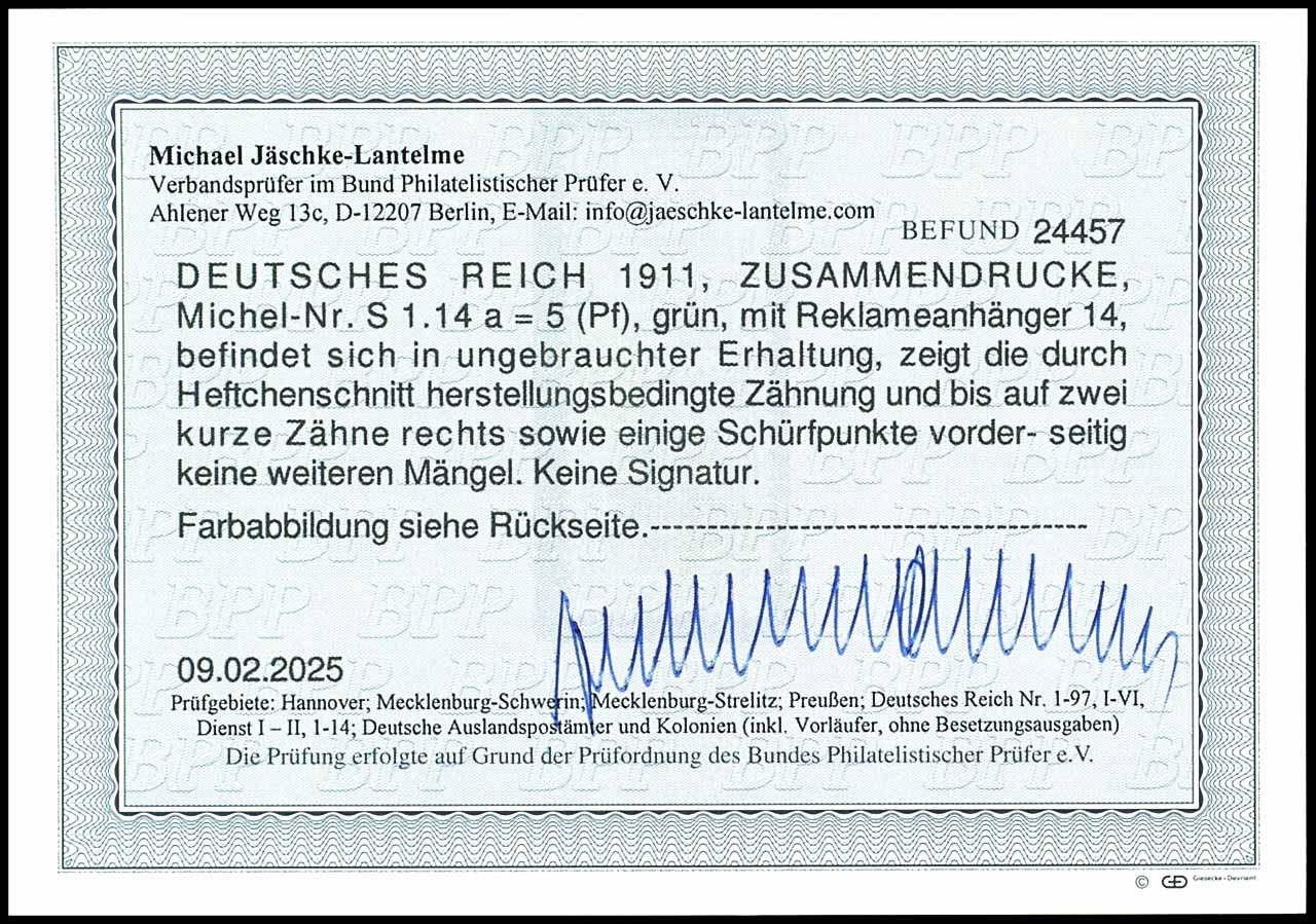 Germania 1911 / 12, advertisement label 14 plus 5 pfennigs, vertical se-tenant, unused with original gum, except for two short perfs right as well as some abrasions points on face without further defects, photo expertize Michael Jaeschke Lantelme BPP (2025), Michel 650.-