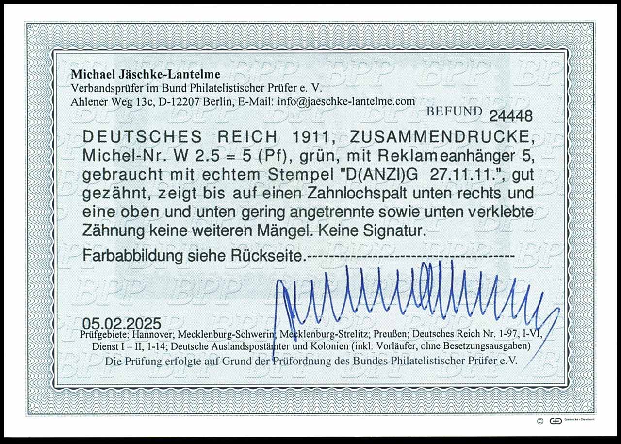 Germania 1911 / 12, advertisement label 5 plus 5 pfennigs green, cancelled "Gdansk 27.11.11", perforation separated and at the bottom again pasted up as well perforation split lower right, photo expertize Michael Jaeschke Lantelme BPP (2025), Michel 450.-