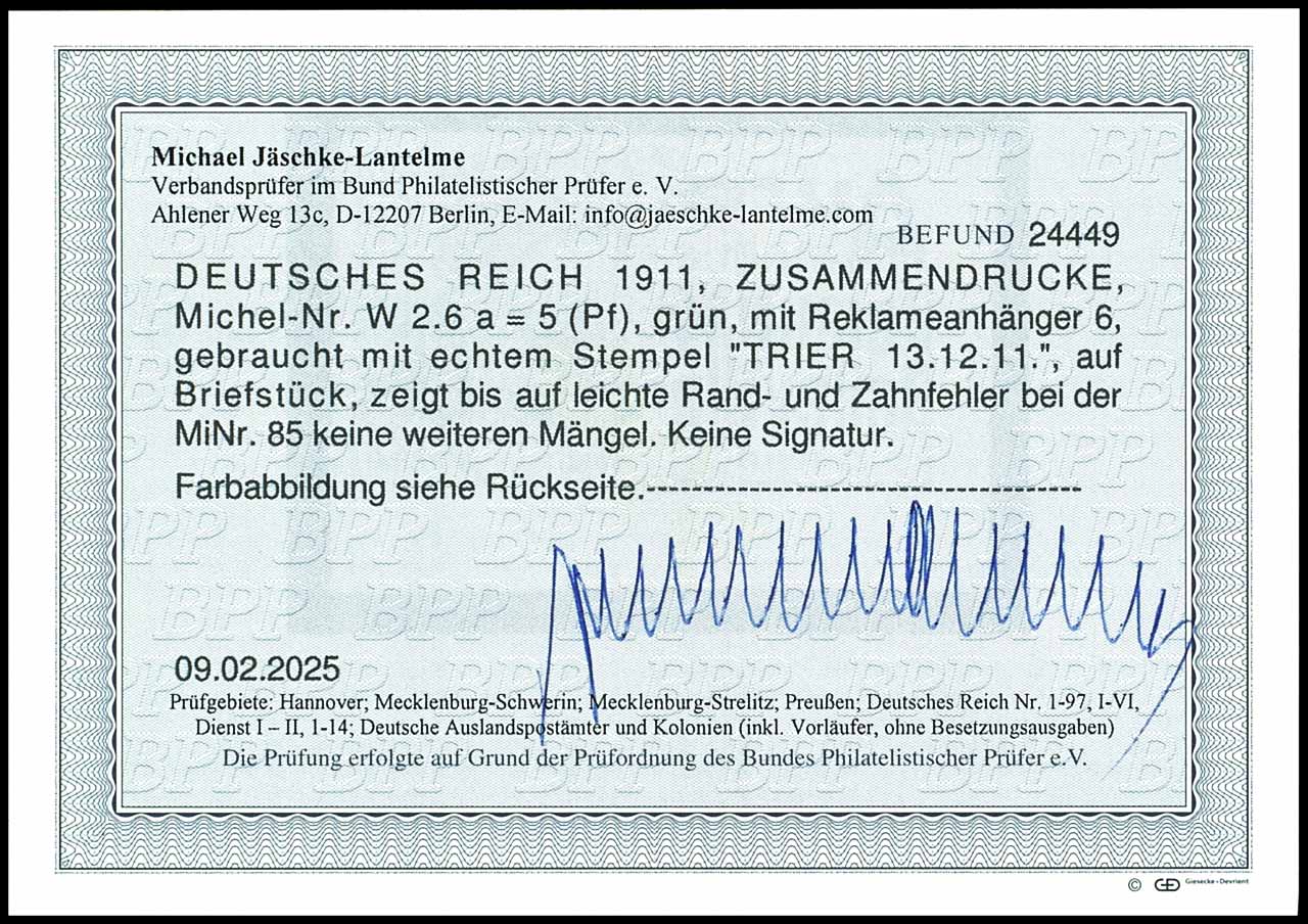 Germania 1911 / 12, advertisement label 6 plus 5 pfennigs green, horizontal se-tenant, cancelled "TRIER 13.12.11" on piece, slight edge and perforation fault, otherwise faultless, photo expertize Michael Jaeschke Lantelme BPP (2025), Michel 600.-