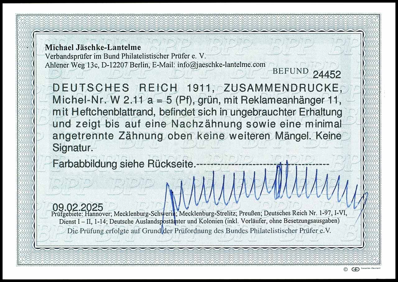 Germania 1911 / 12, advertisement label 11 plus 5 pfennigs green with attaching booklet sheet margin, horizontal se-tenant, unused with original gum, re-perforation and minimal separated perforation above, photo expertize Michael Jaeschke Lantelme BPP (2025), Michel 380.-