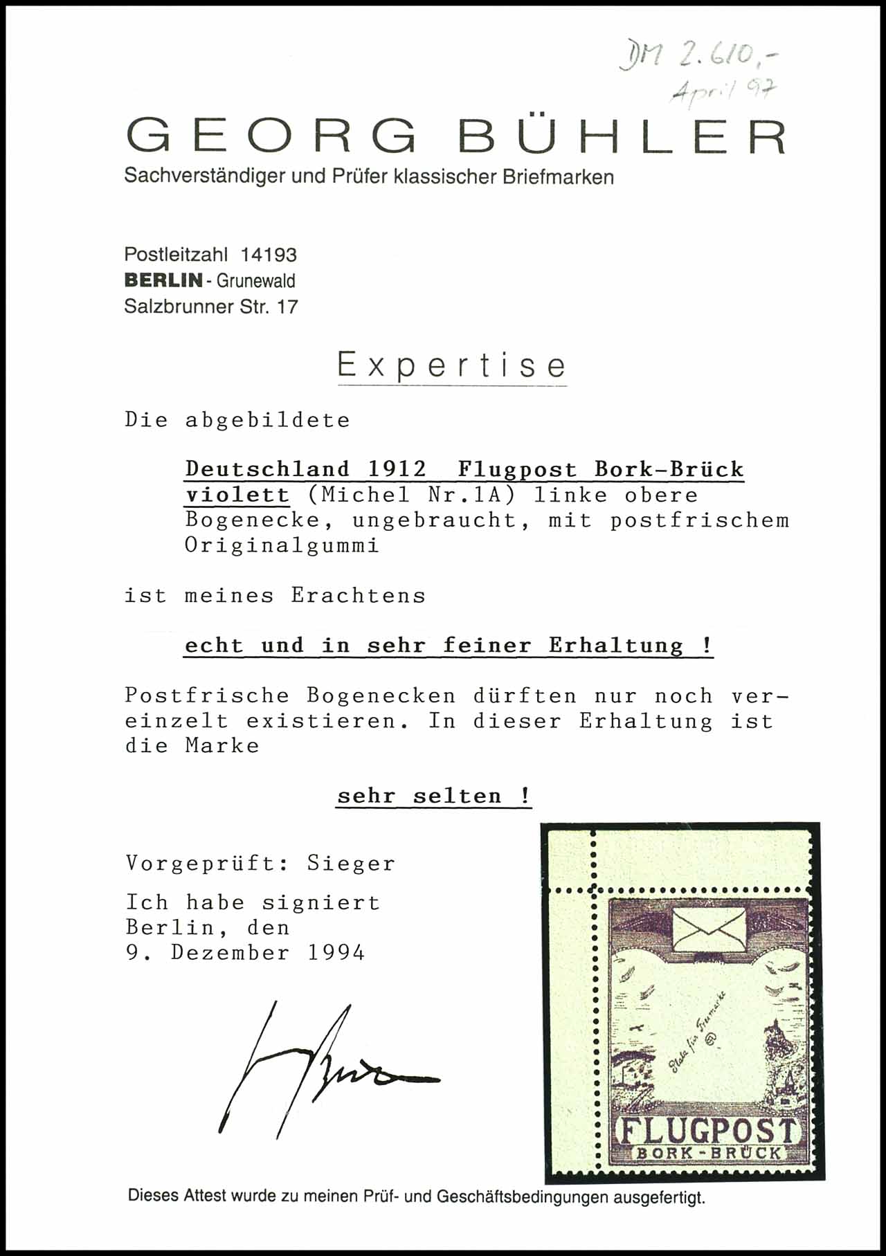 airmail stamp for Bork Bruck perforated L 12, left upper corner of the sheet perfectly mint never hinged, expertized winner and photo expertize Georg Buehler, Michel 1.400.-