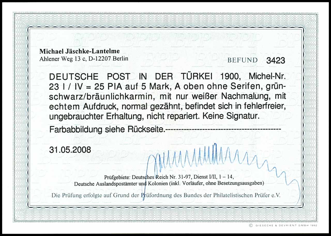 25 piastre on 5 Mark green black / brownish carmine, unused, very fine, photo expertize Jaeschke L. BPP, Michel 380.-