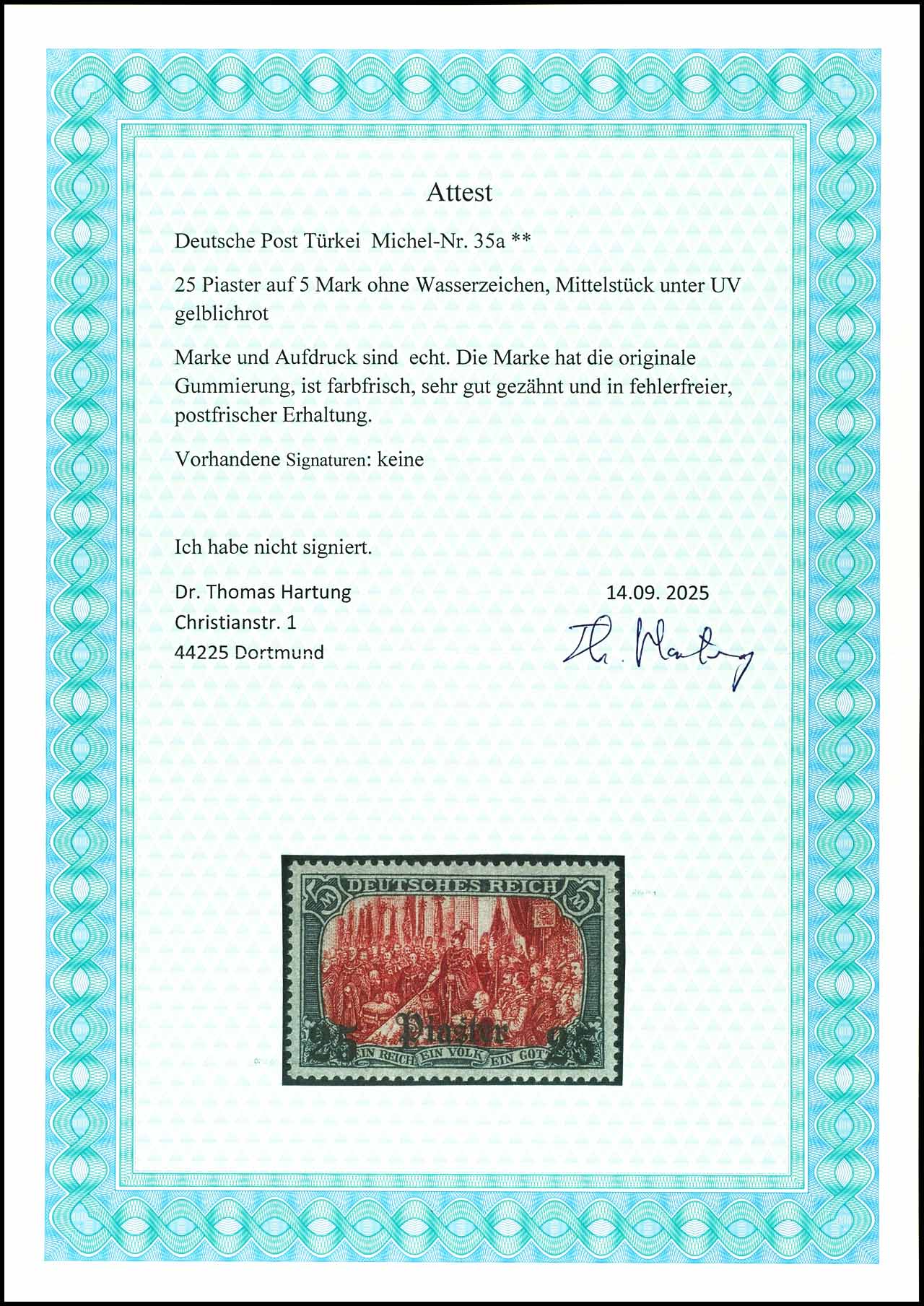 25 piastre on 5 Mark without watermark perfectly mint never hinged and still unsigned, photo expertize Dr. hardening "very well perforated and in faultless, mint never hinged condition. " Michel 650.-