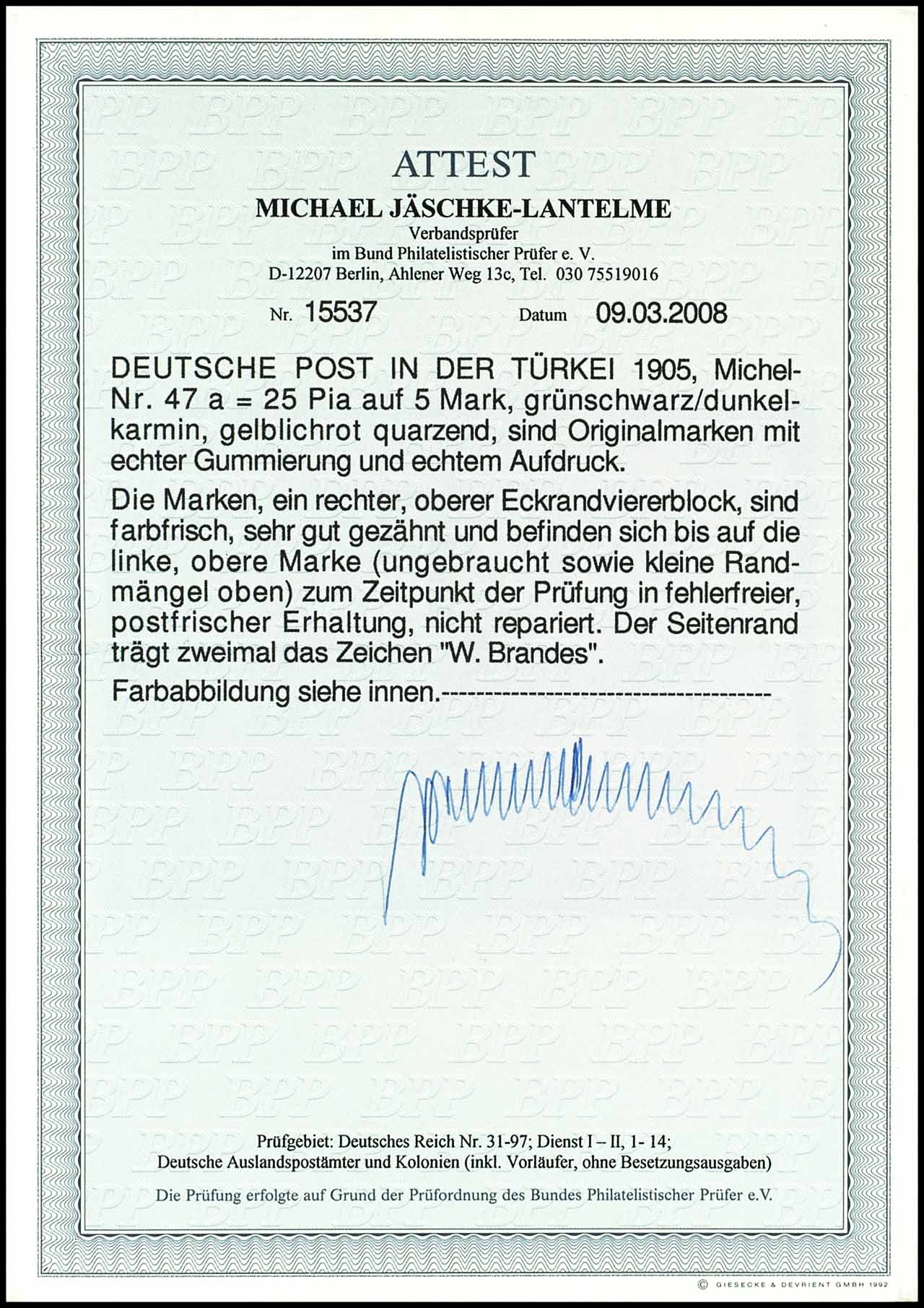 25 piastre on 5 Mark German Reich, corner margin block of four top right, left upper stamp unused and small margin defects, otherwise perfectly mint never hinged, photo expertize Michael Jaeschke Lantelme BPP