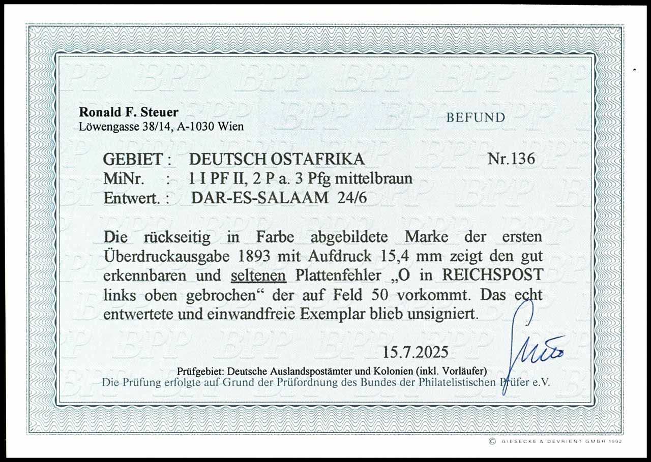 2 Pesa on 3 pfennigs crown / eagle mid-brown, overprint 15, 4 mm wide, plate flaw II "O of imperial post left above broken", cancelled "Daressalaam 24 / 6", very fine, rare, photo expertize Ronald F. Steuer BPP (2025) "perfectly copy. "