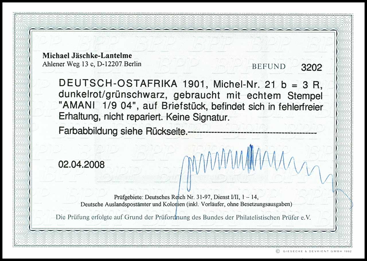 3 Rupee imperial yacht dark red / green black, cancelled "AMANI 1 / 9 04" on piece, very fine, photo expertize Michael Jaeschke Lantelme BPP "in perfect condition. "