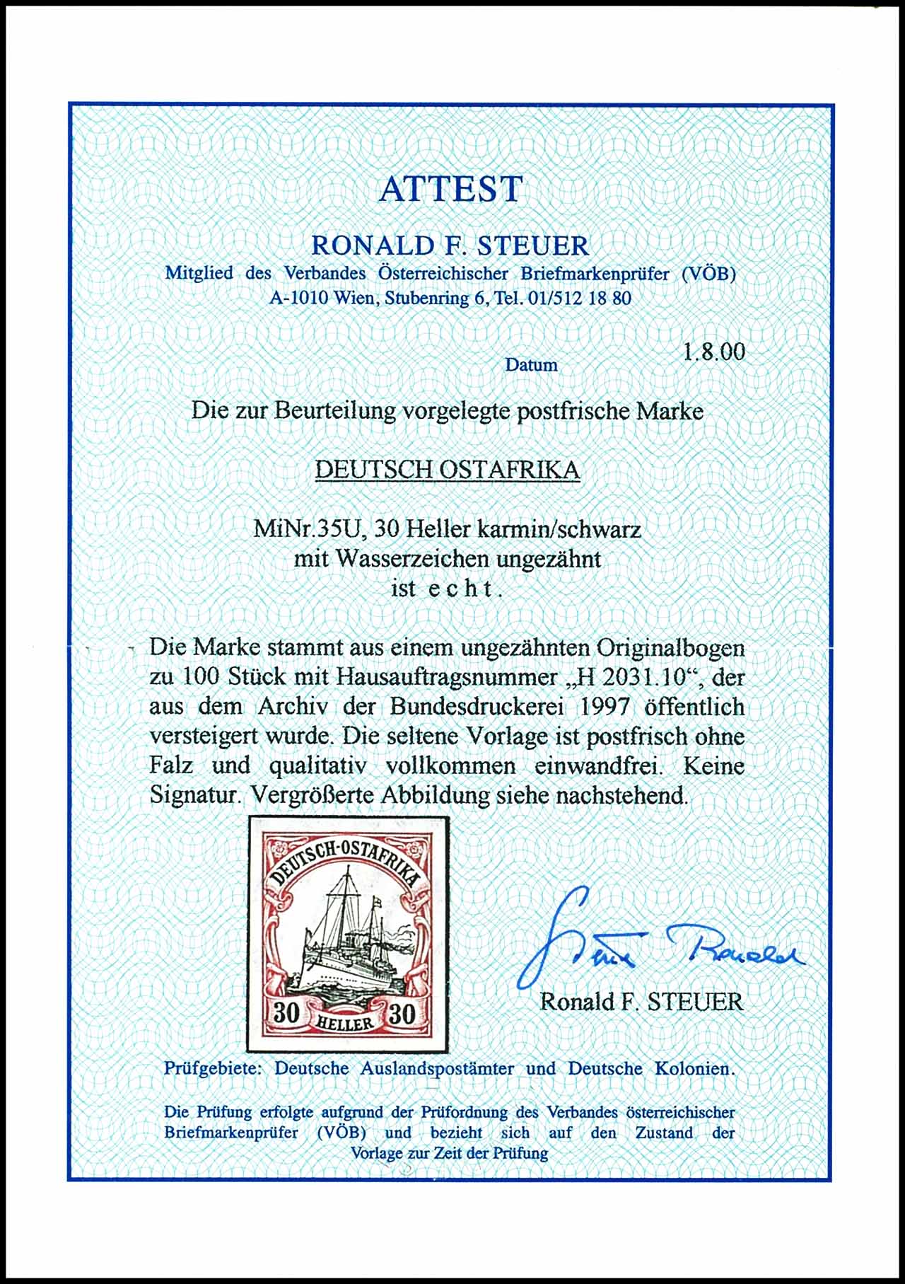 30 Heller imperial yacht carmine / black, imperforated, mint never hinged, very fine, rare, from the 1997 sold by auction sheet springing - issued only 100 examples, photo expertize Steuer VOEB, Michel 2.000.-