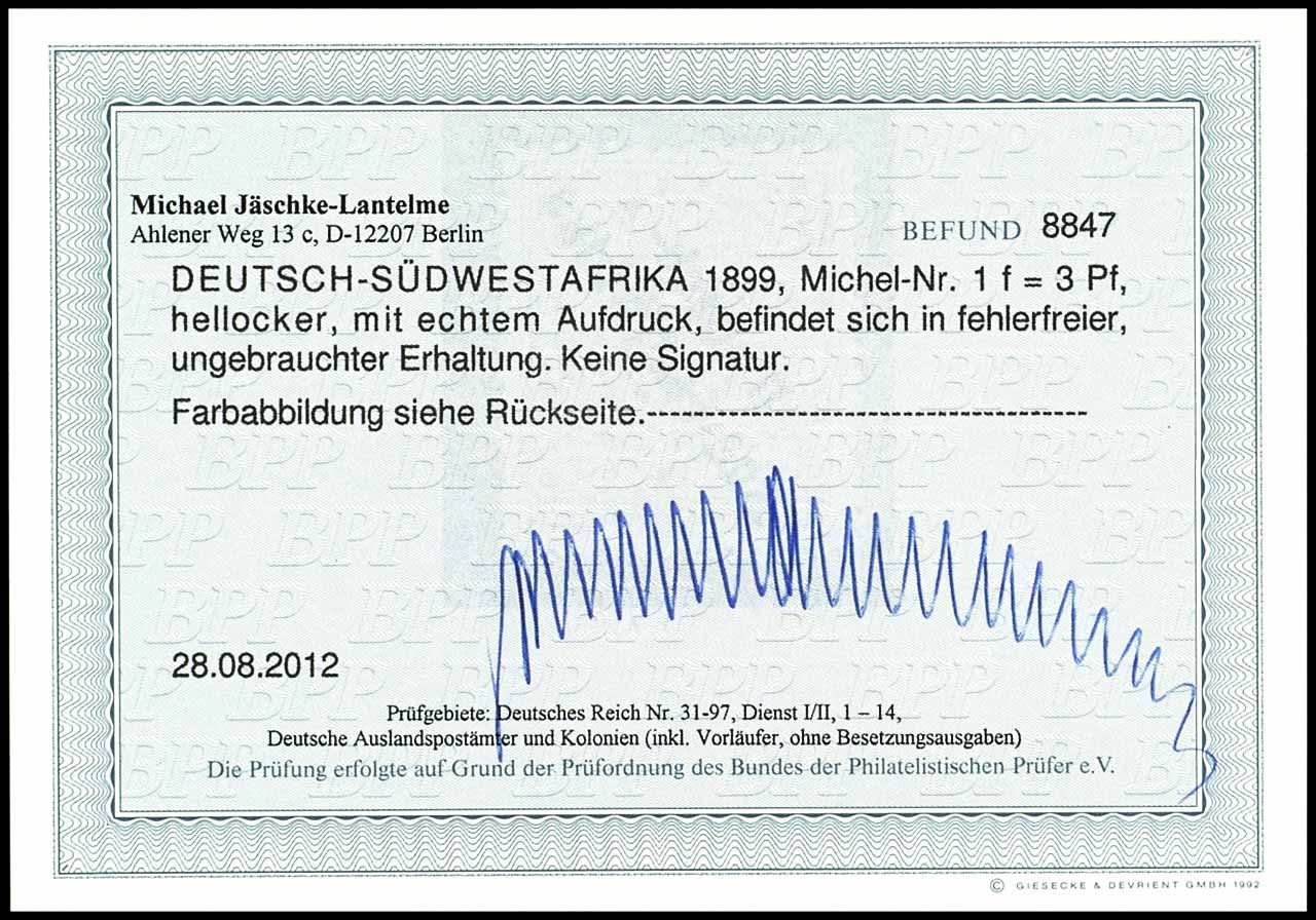 3 Pf pale ocher sound unused with only tiny, hardly visible hinge trace, photo expertize Jaeschke Lantelme BPP: "in faultless, unused condition. " Michel 350.-