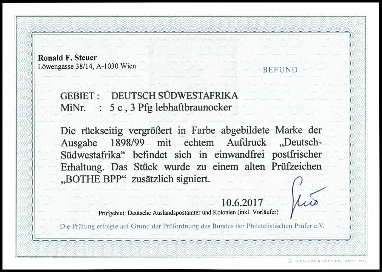 3 Pf bright brown ocher perfectly mint never hinged, signed on the base Bothe BPP and R. F. Steuer BPP, as well photo expertize R. F. Steuer BPP "in perfect mint never hinged condition. " Michel 300.-