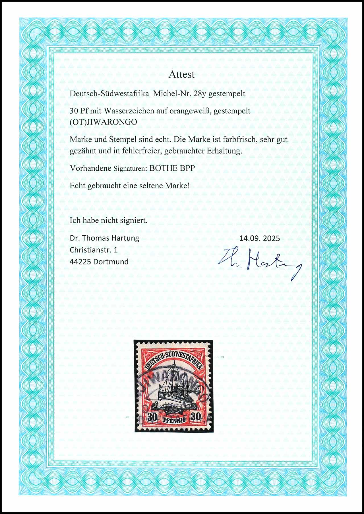 30 Pf on orange white neat cancelled (OT) JIWARONGO, signed on the base Bothe BPP and photo expertize Dr. hardening "very well perforated and in faultless, used condition. " Michel 3.000.-