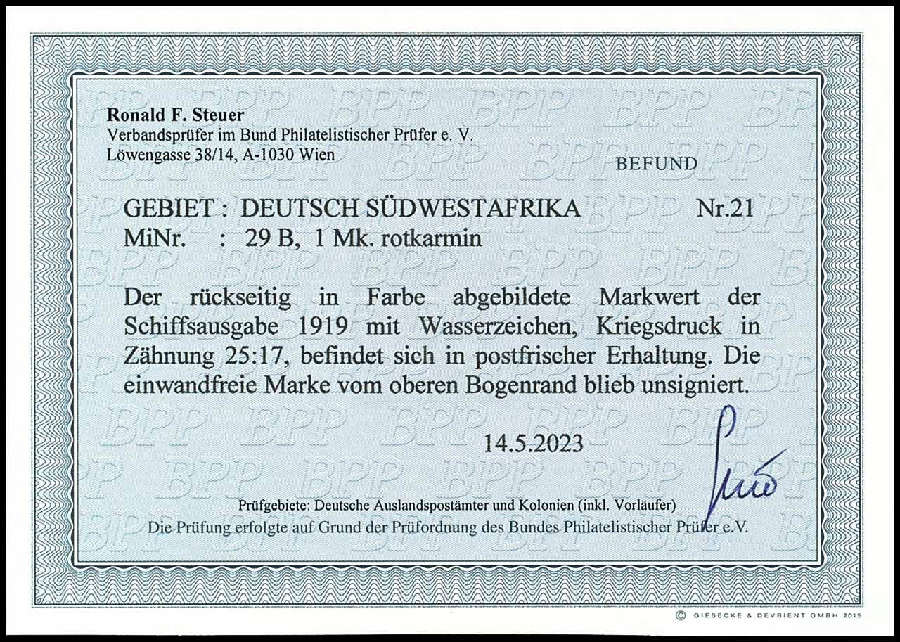 1 Mark imperial yacht, war time printing, 25 : 17 perforation holes, from upper margin of sheet, perfectly mint never hinged, unsigned outstanding quality, photo expertize R. F. Steuer BPP (2023) "perfect", Michel 320.- plus plus