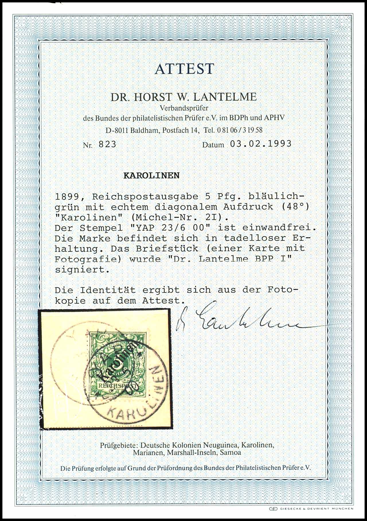 5 pfennigs opal green with diagonal overprint, letter piece, very fine, photo expertize Dr. Lantelme BPP, Michel 750.-