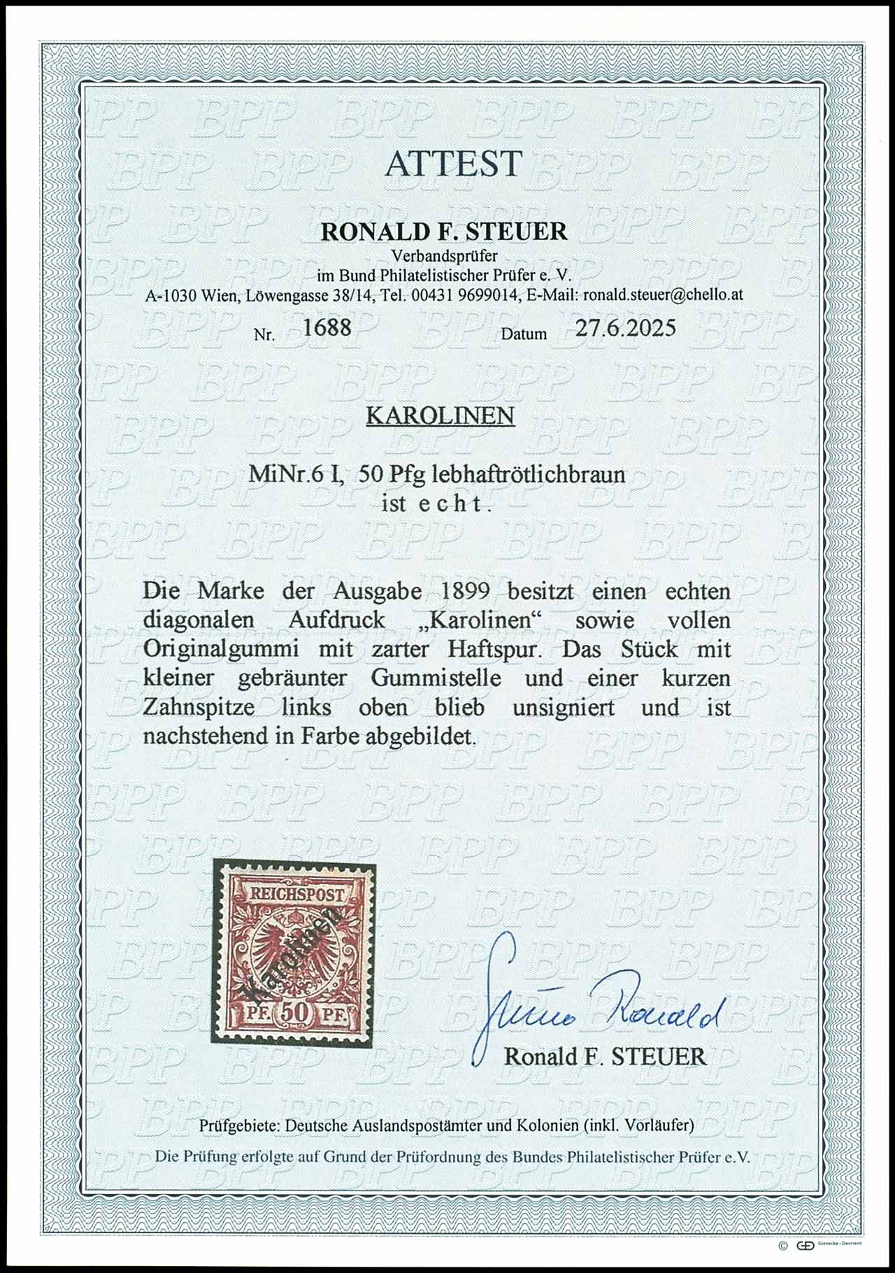 50 pfennigs crown / eagle, bright red brown with black, diagonal typography overprint "Caroline" unused with original gum, apart from a short perf tip left above in perfect condition, photo expertize Ronald F. Steuer BPP, Michel 800.-
