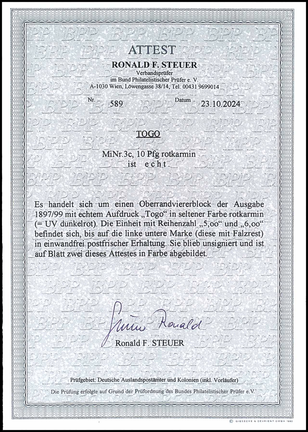 10 Pf red carmine, UV dark red, perfectly mint never hinged from upper margin and still unsigned, photo copy of a certificate Ronald F. Steuer BPP (for block of four) "in perfect mint never hinged condition. " Michel 700.-