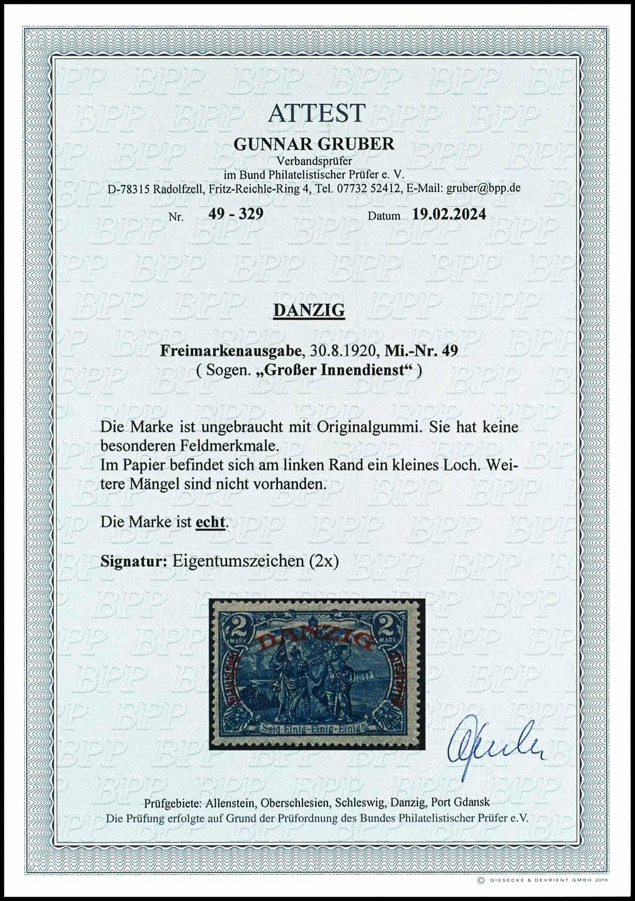 2 Mark "high values only for franking by the postal service", unused with original gum, in the paper is in the leftmost position a small hole, issued only 2.280 piece, property sign, photo expertize Gunnar Gruber BPP, Michel 1.400.-