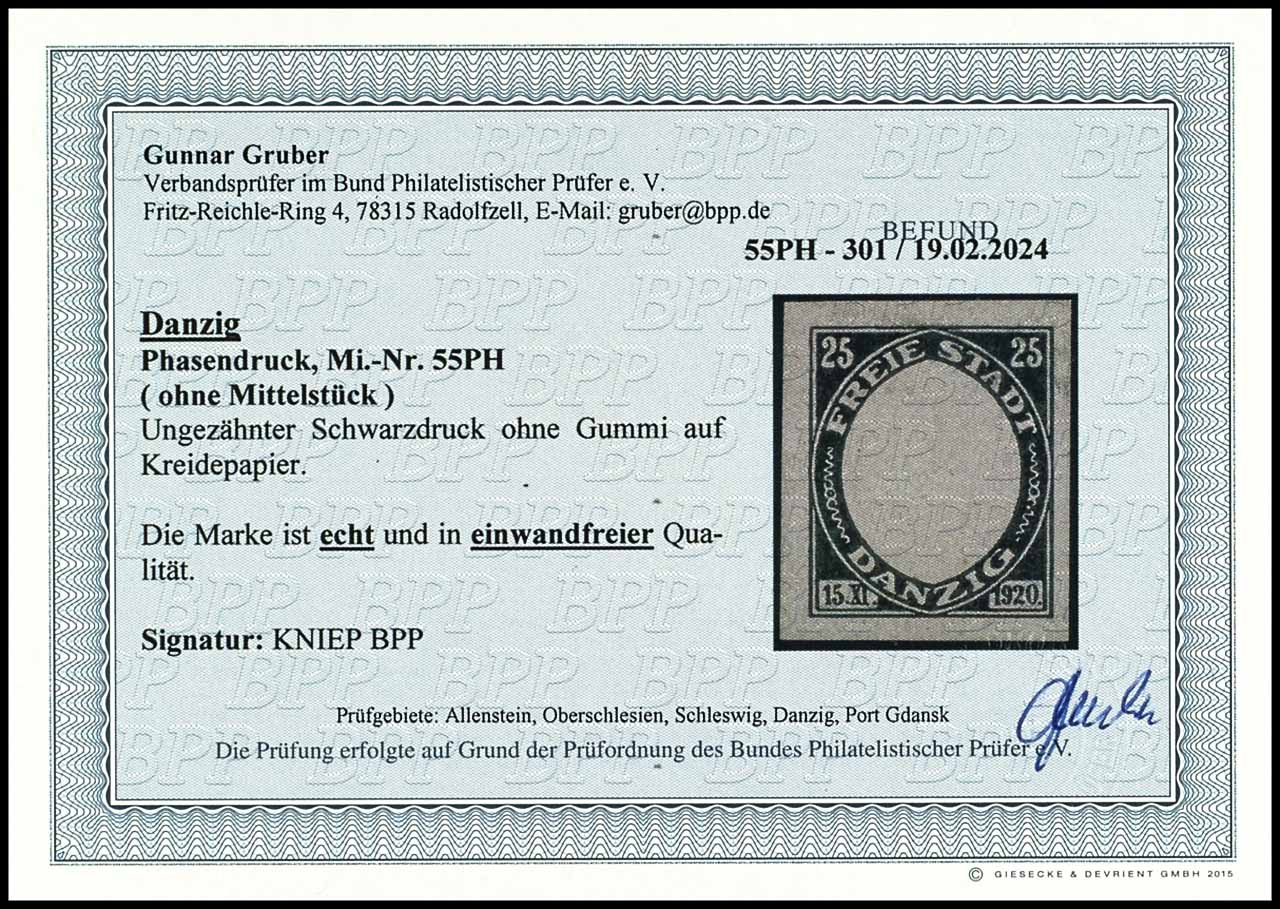 25 pfennigs "Danziger cog", imperforated black phase print only of the frame, sound ungummed, expertized Kniep BPP, photo expertize Gunnar Gruber BPP. "genuine and in perfect quality. "