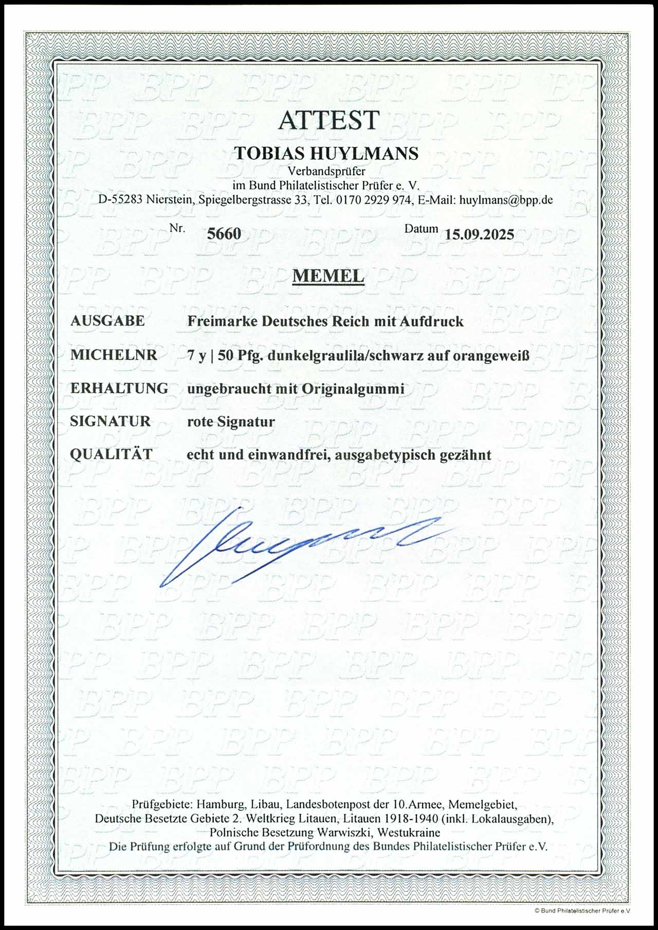 50 pfennigs Germania dark gray purple / black on orange white paper with two-line overprint "Memel area", unused with original gum, very fine in issue typical perforation, signed, photo expertize Tobias Huylmans BPP (2025) "perfect"